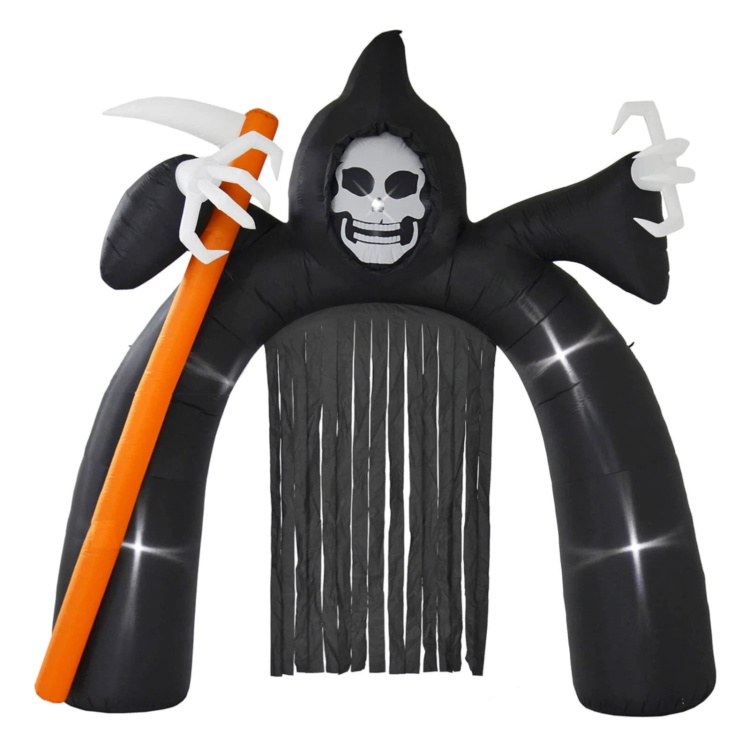 The extra large light up inflatable Halloween decoration is designed like a gateway. Guarded by the Grim Reaper with skull face, orange handle scythe and skeleton hands, it has a black stranded curtain for your doorway. This creepy Halloween inflatable is lit by 5 white LED lights and is 3.65m (12′) high. Suitable for indoor and outdoor use.