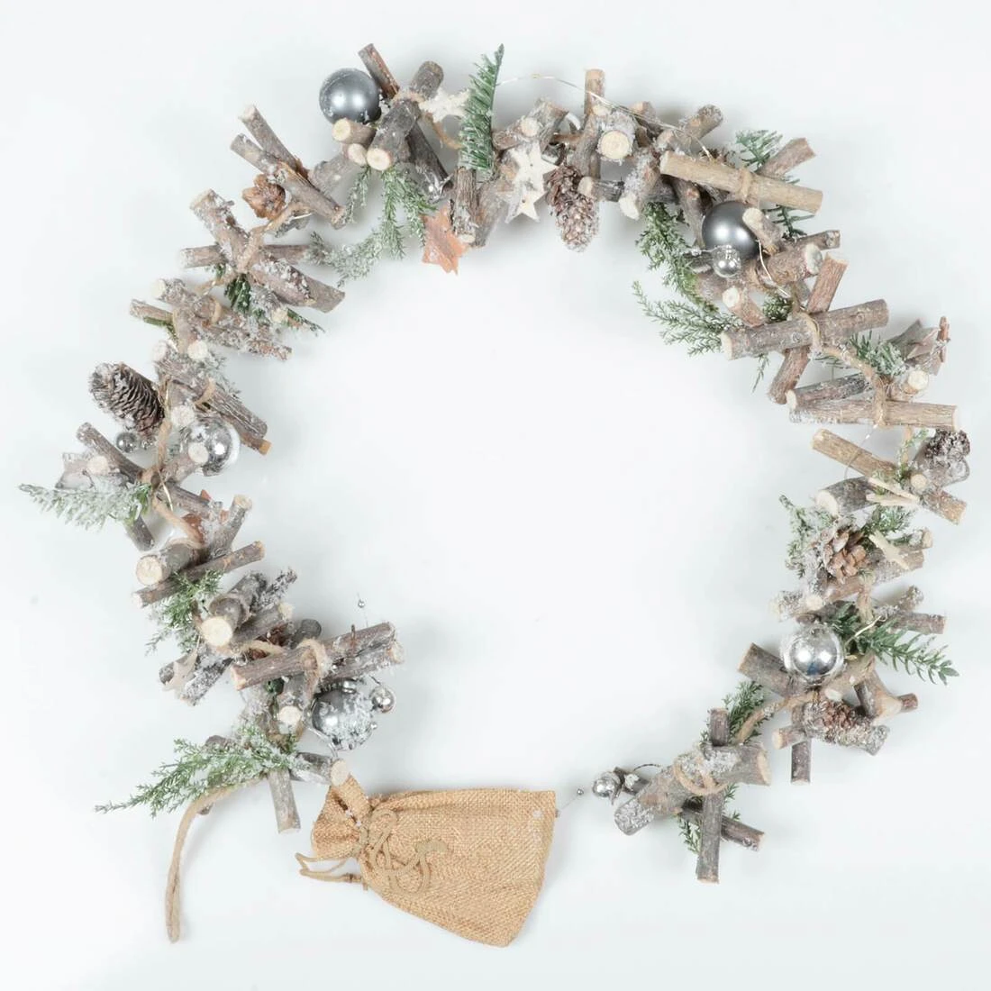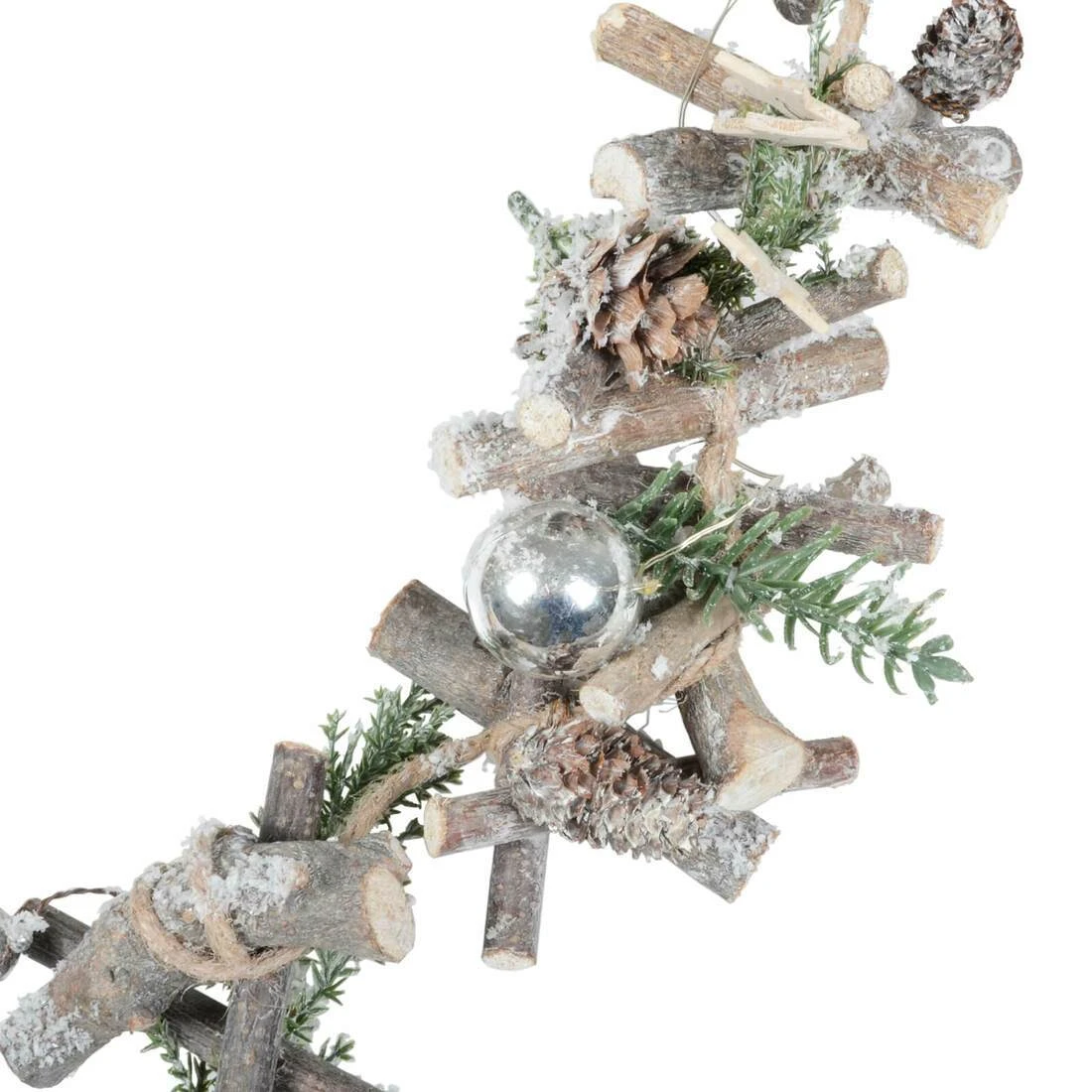This stunning wooden garland has been decorated with green foliage, silver baubles and other festive accessories.