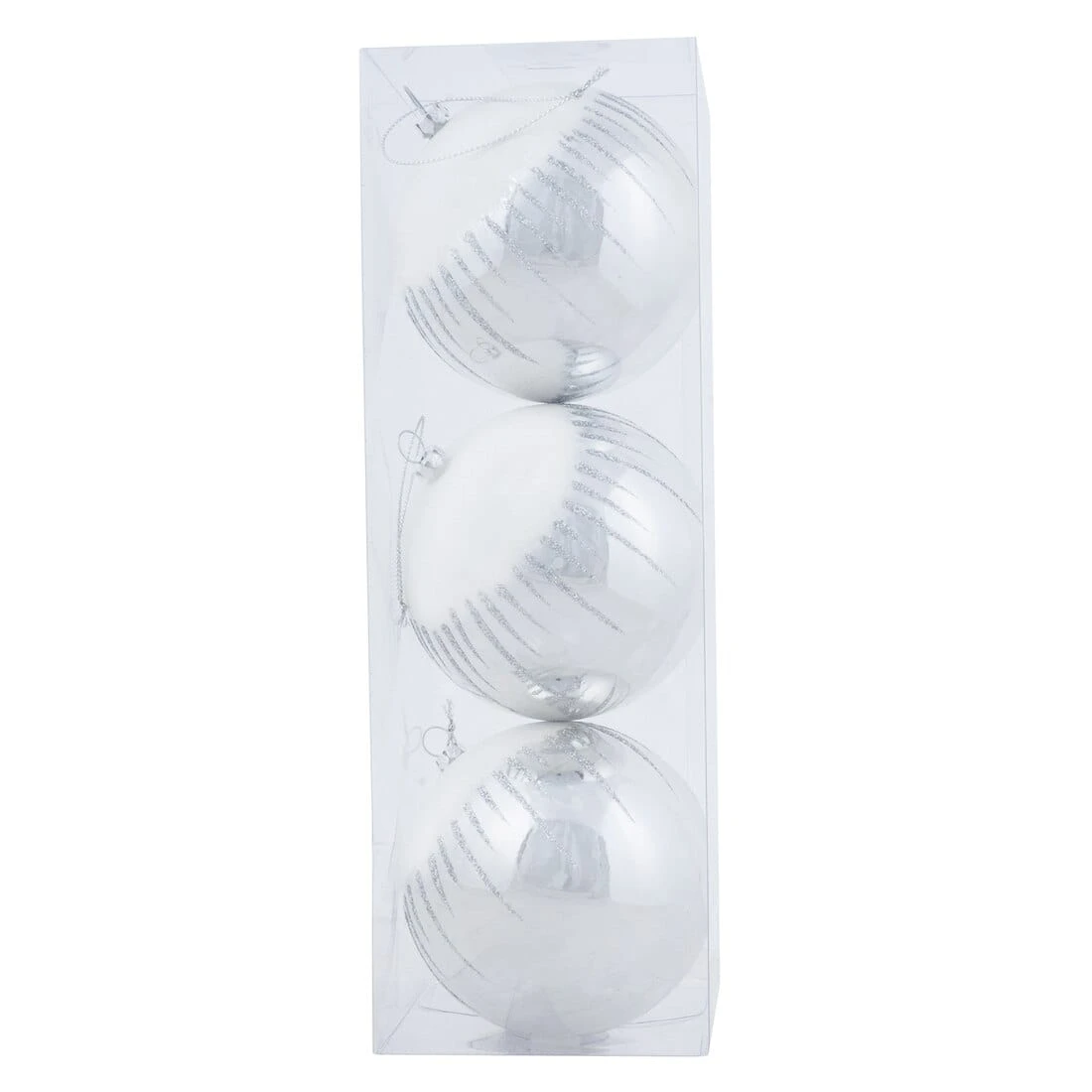Each set comes with three round mirror finish baubles, each styled white glistening snow on the top and glittery drips round the sides. The baubles all have a diameter of 10cm and are finished with a silver cap and silver hanging thread. Choose from silver, red and gold.