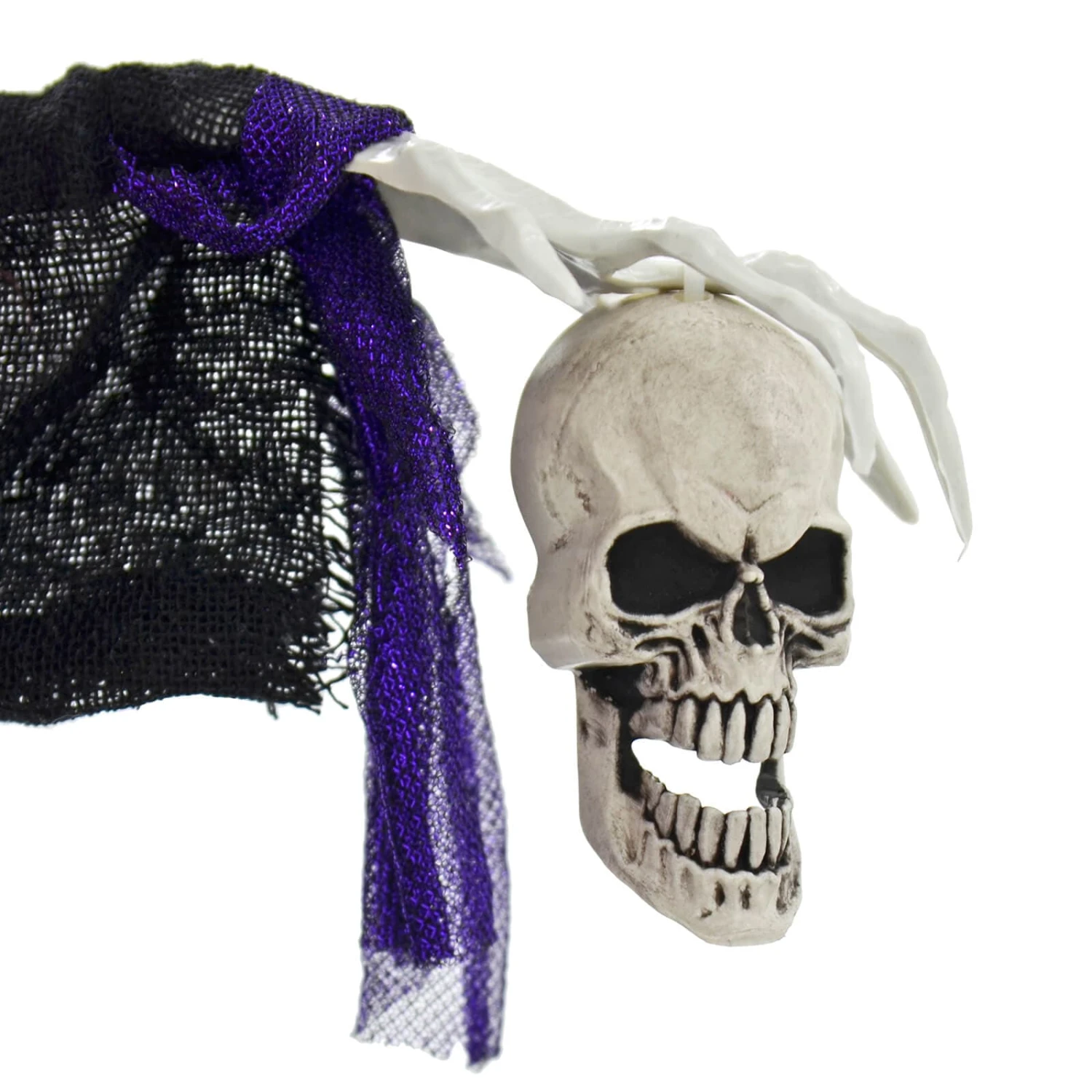 The Hanging Witch Halloween decoration has flashing red LED eyes, red hair and cackles with evil laughter. Holding a skull in her hand, she is dressed in black with gold and silver stars, glittering blue belt, purple cape and pointy hat. At 130cm (4′ 3″) tall it’s perfect for Halloween parties.
