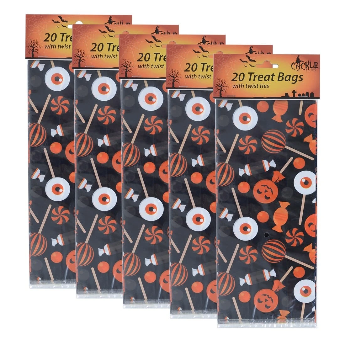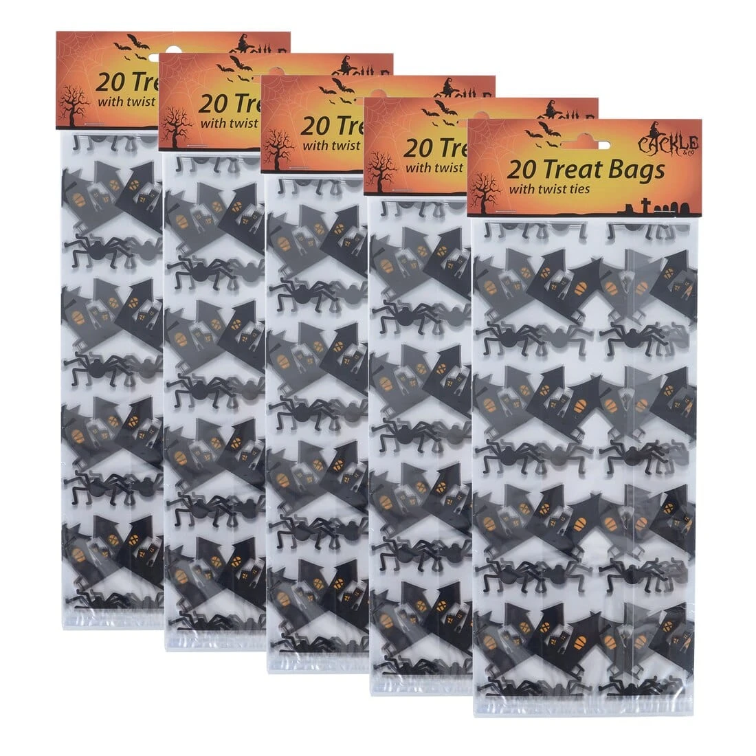 You will receive five packs of twenty cellophane bags in either our ‘Trick or treat’ or ‘Haunted House’ spooky styles.