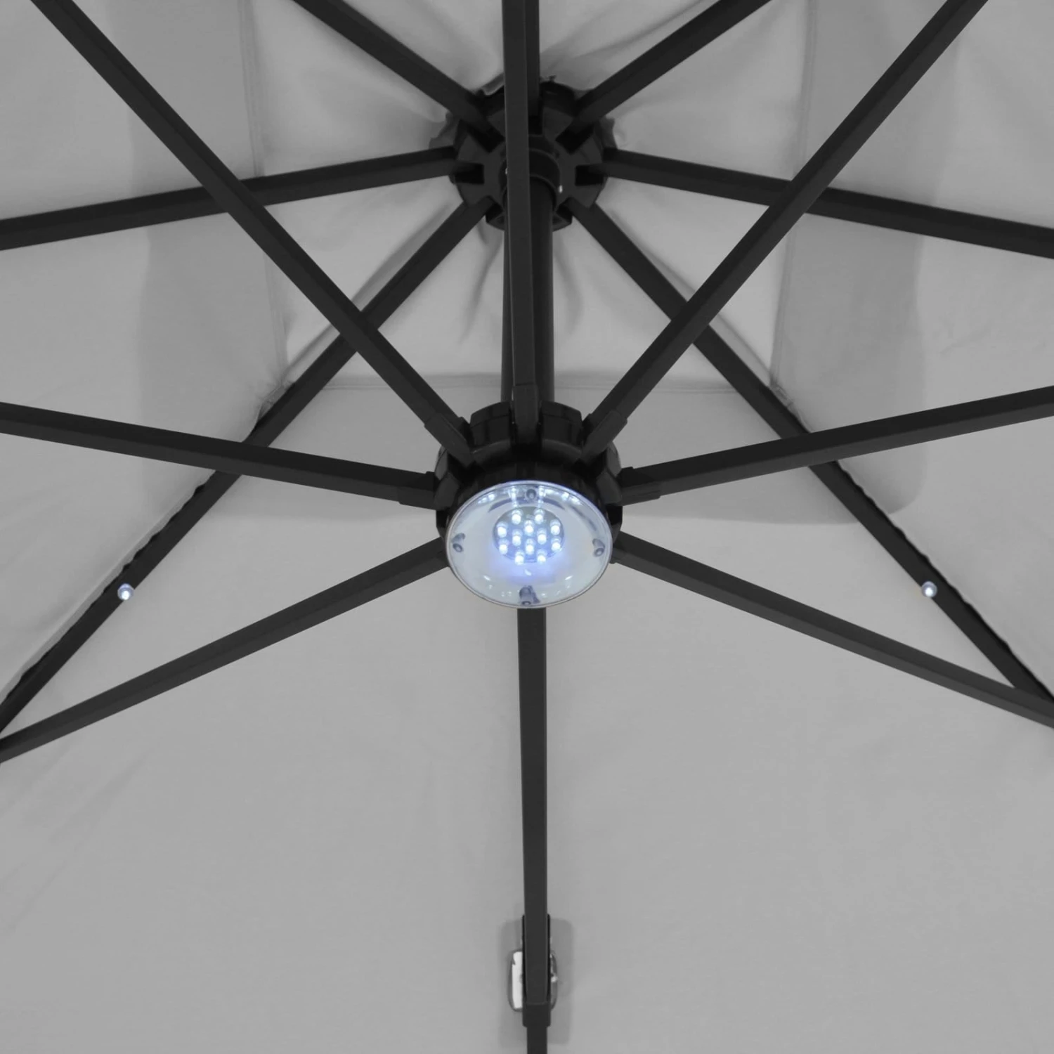 The cantilever bistro-style sun parasol has 25 white solar-powered LED lights on the canopy.