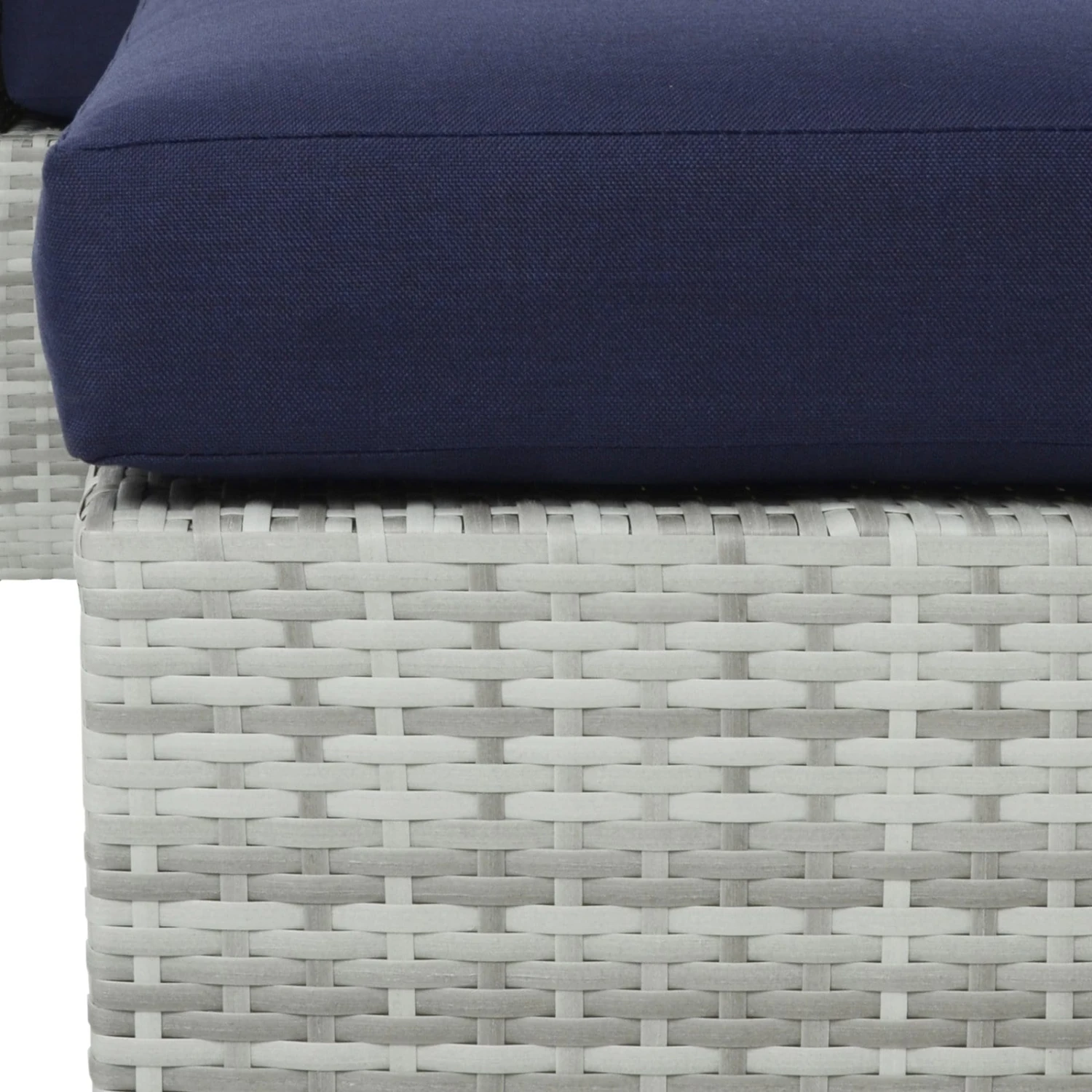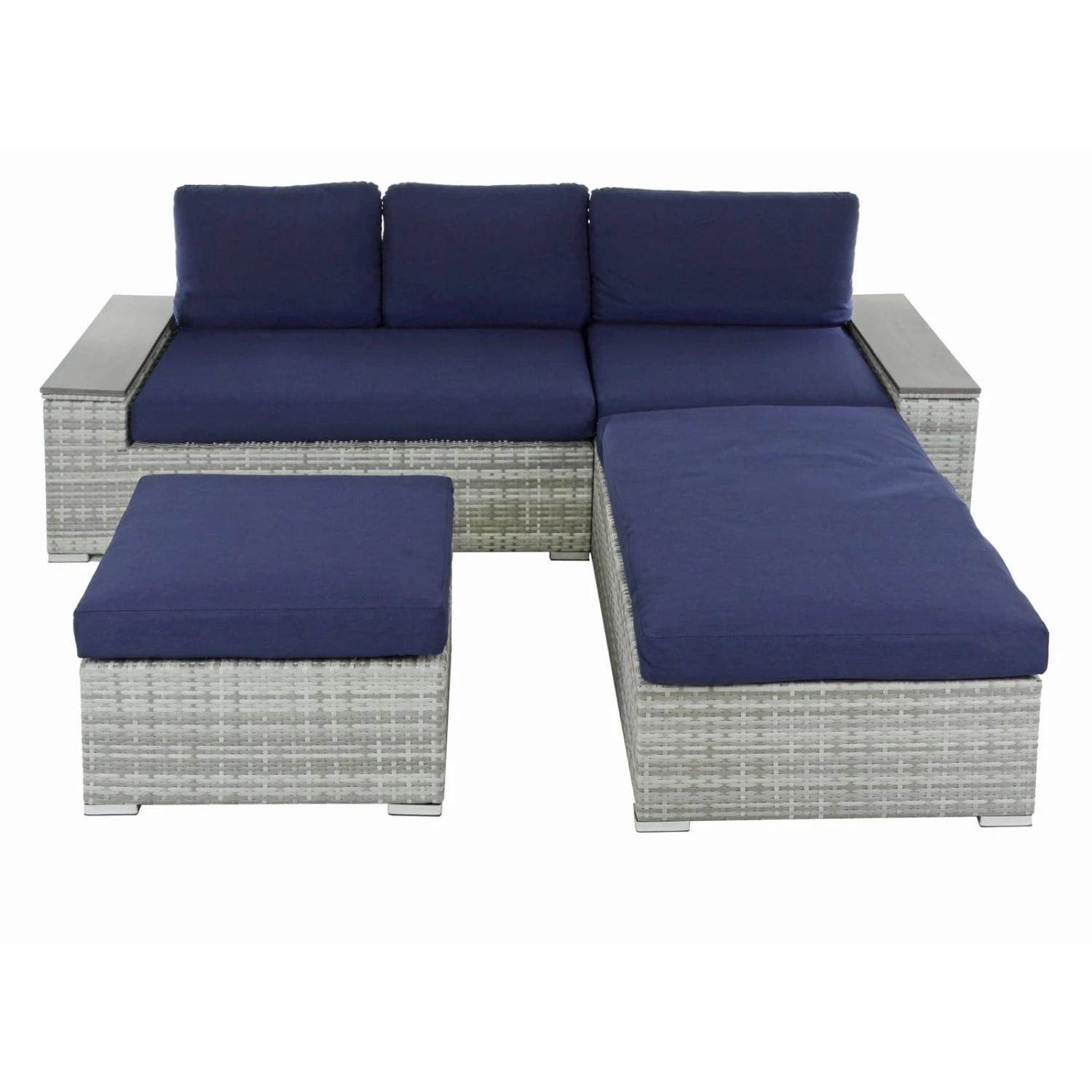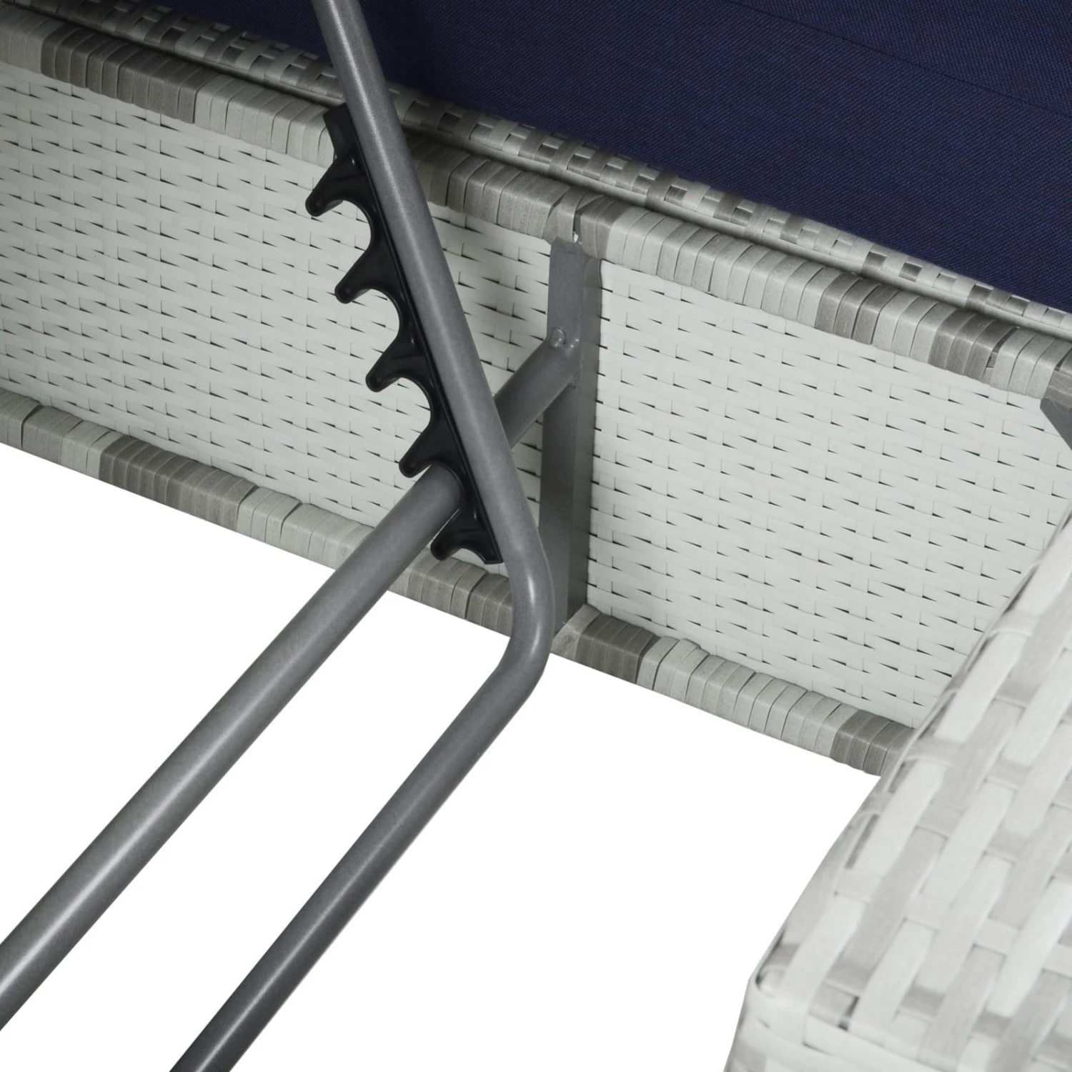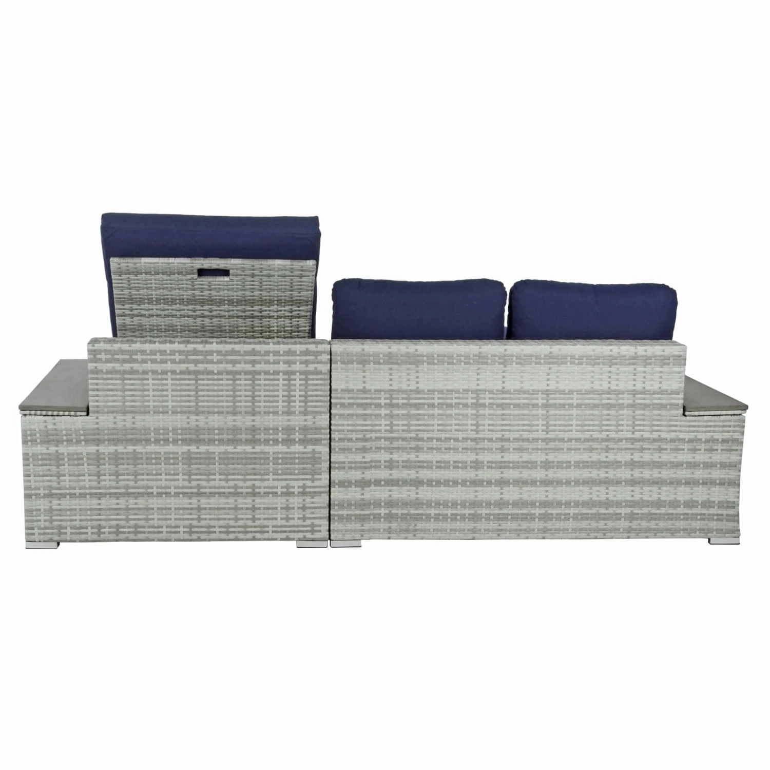 Add a touch of the Greek Med to your garden with this 2 seater sofa and sun lounger set. The two tone grey rattan weave garden furniture comes with navy blue cushions, matching ottoman seat and side tables with storage space. The lounger can be set to 4 positions so you can relax outdoors in comfort and style this summer!