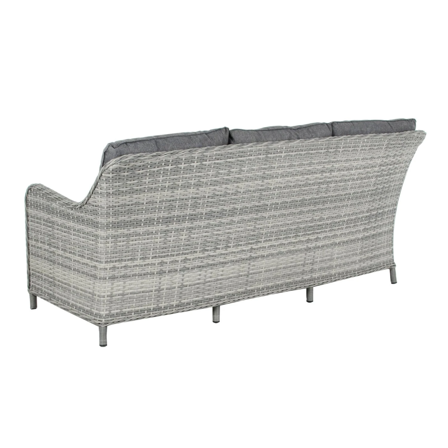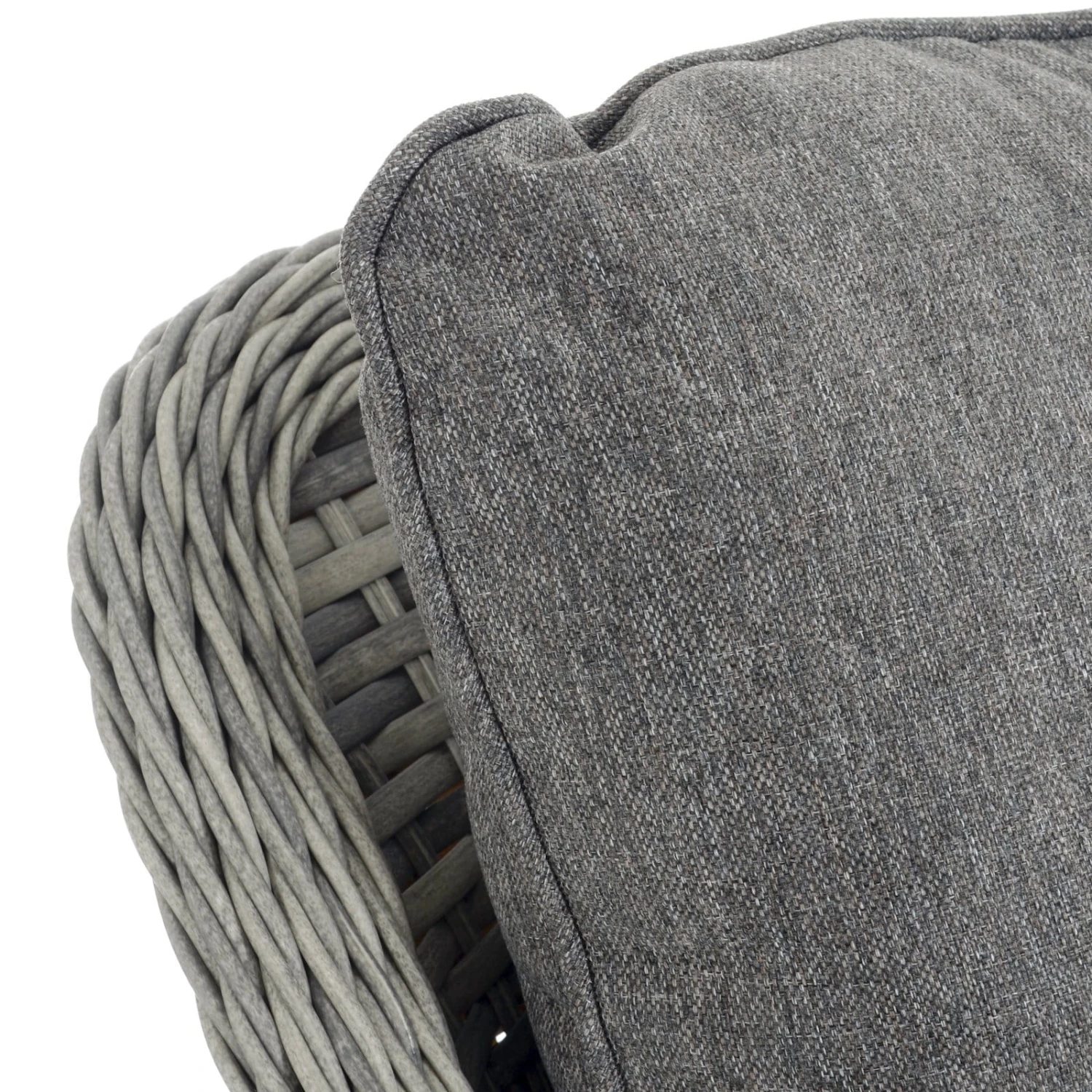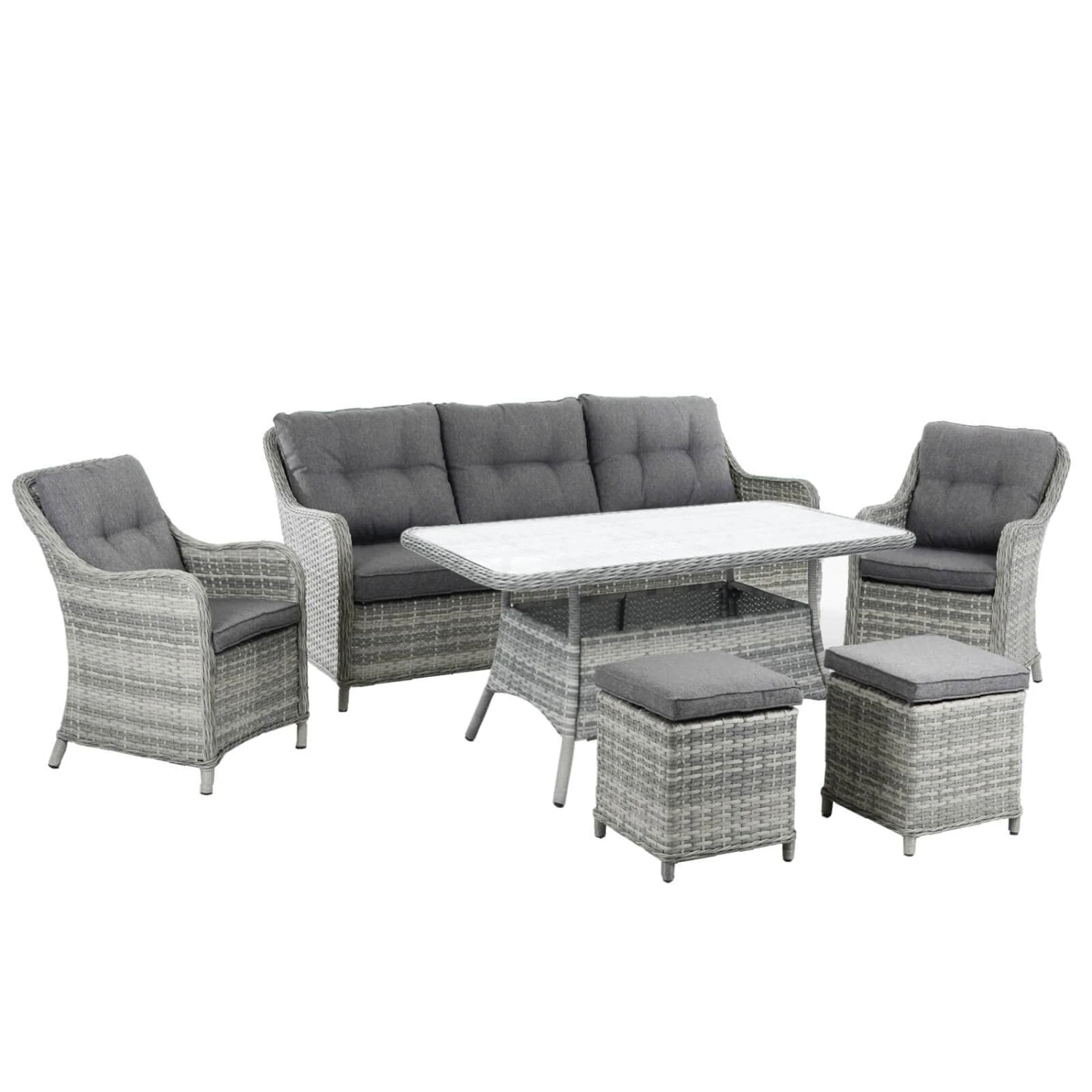 The luxurious, two tone, grey rattan Barletta Sofa Dining Set will seat 7 adults and includes a 3 seater sofa, 2 armchairs, 2 ottoman seats and a glass topped dining table. Comes with grey seat pads and button tufted back cushions.