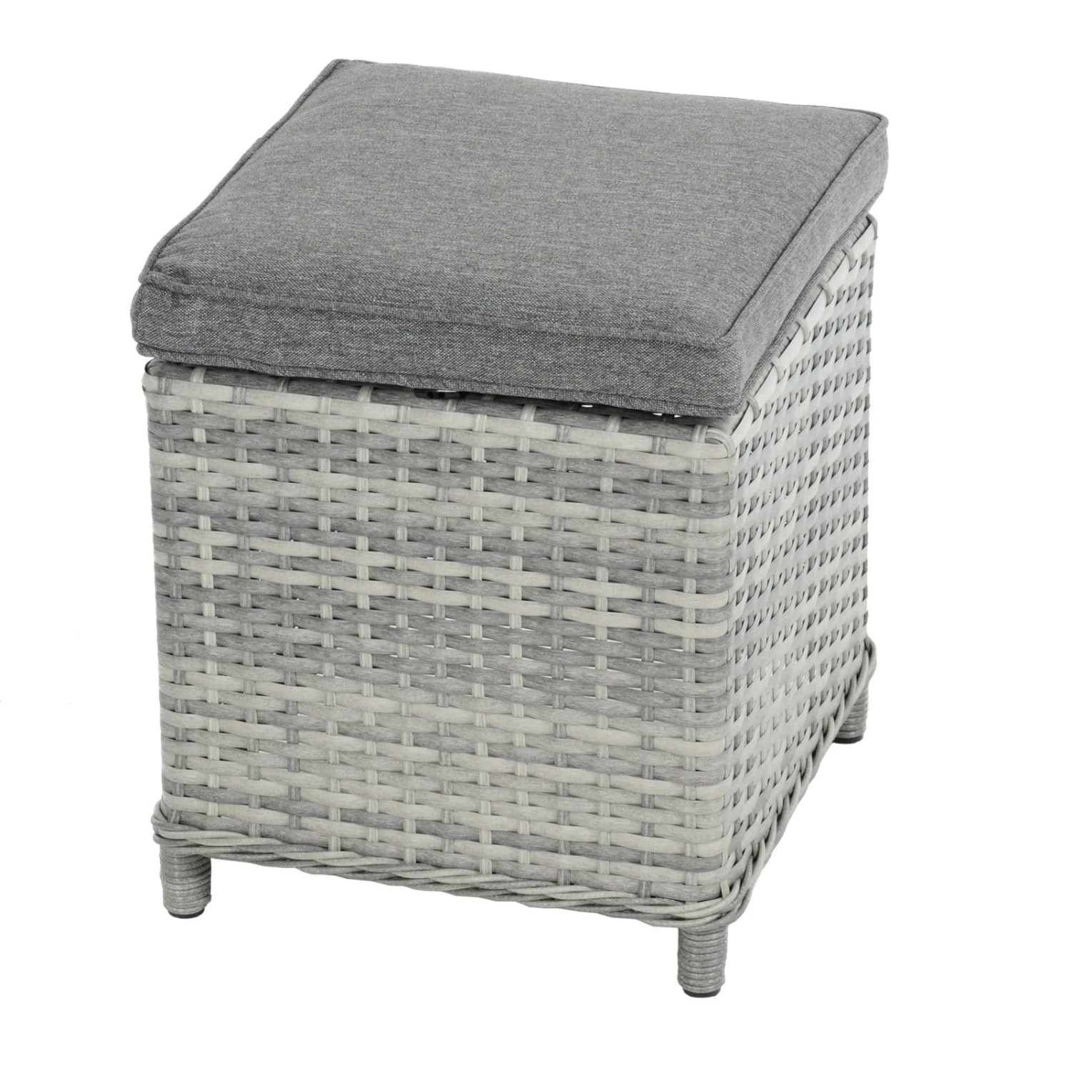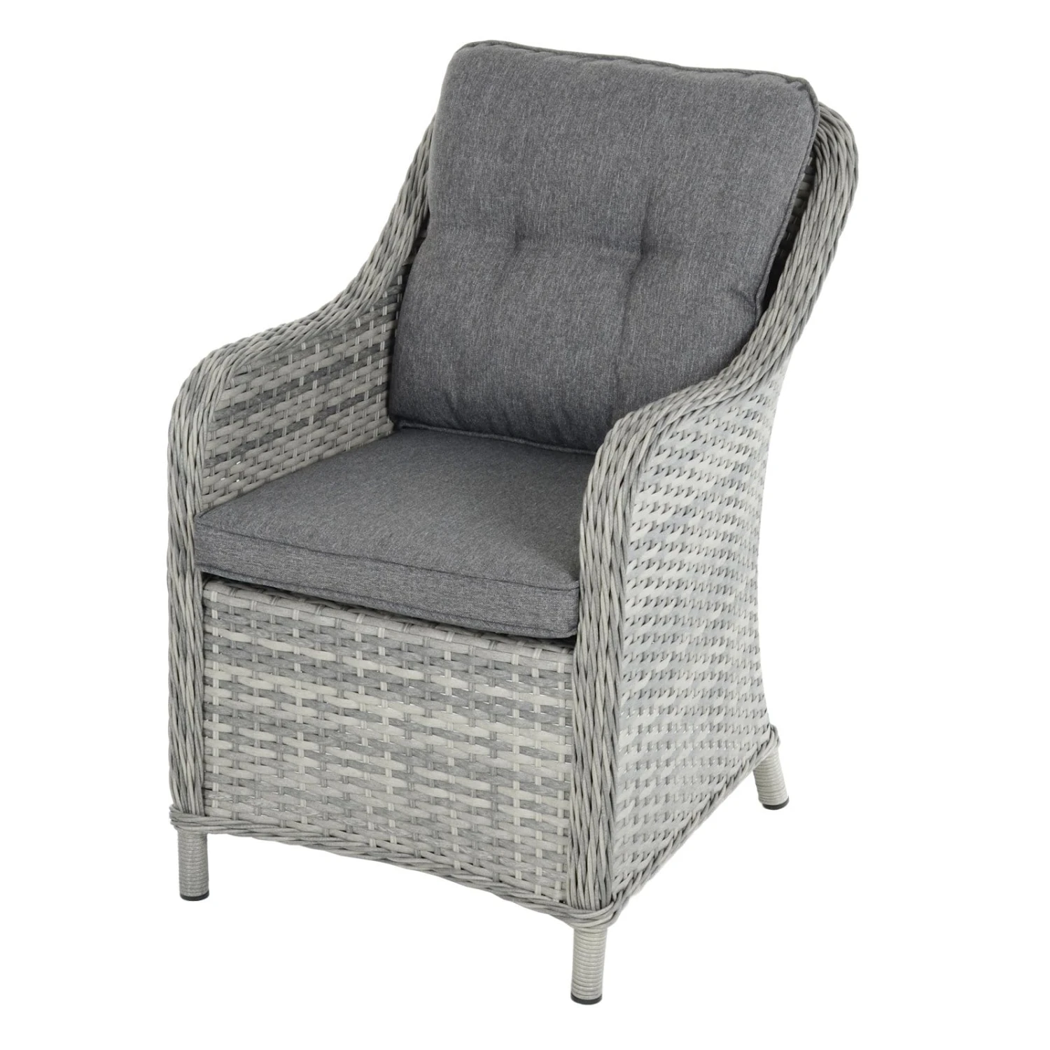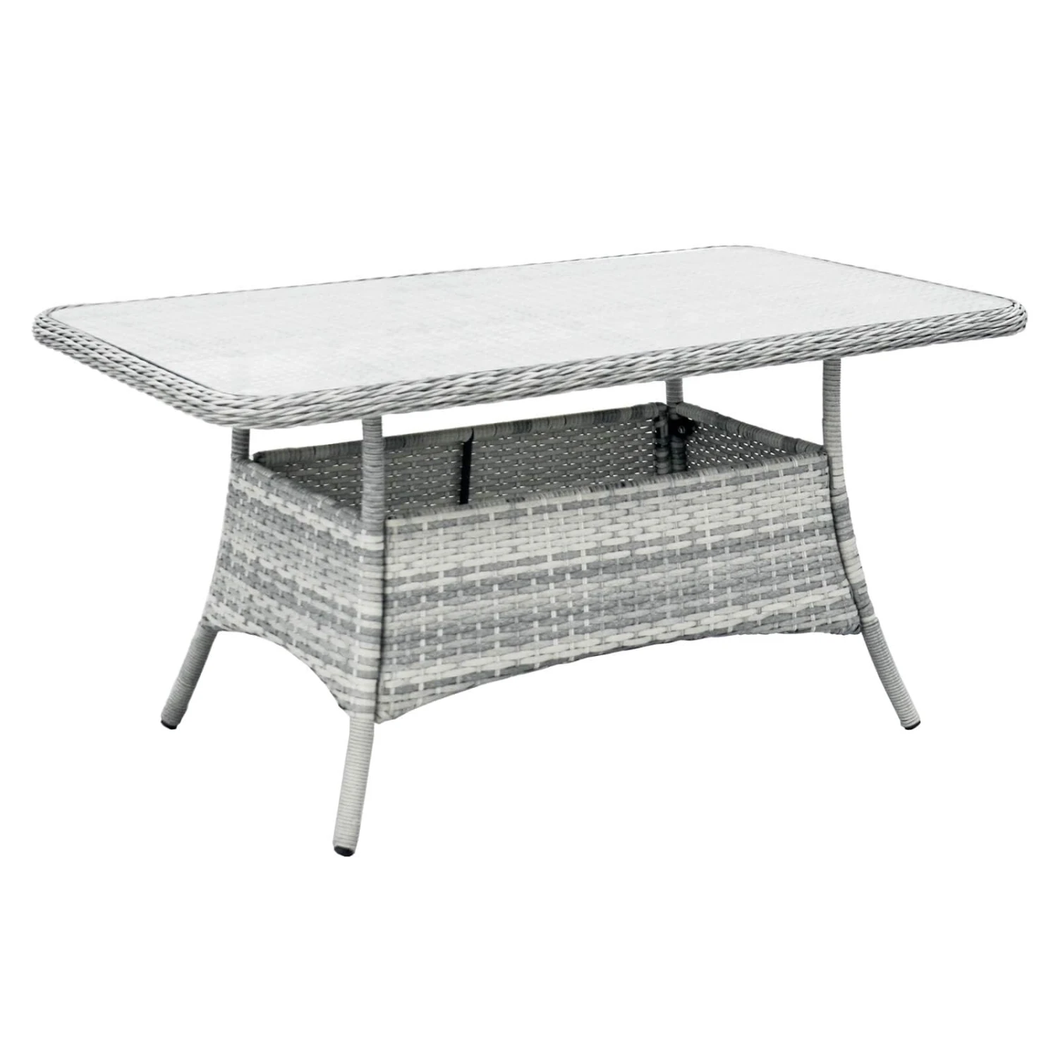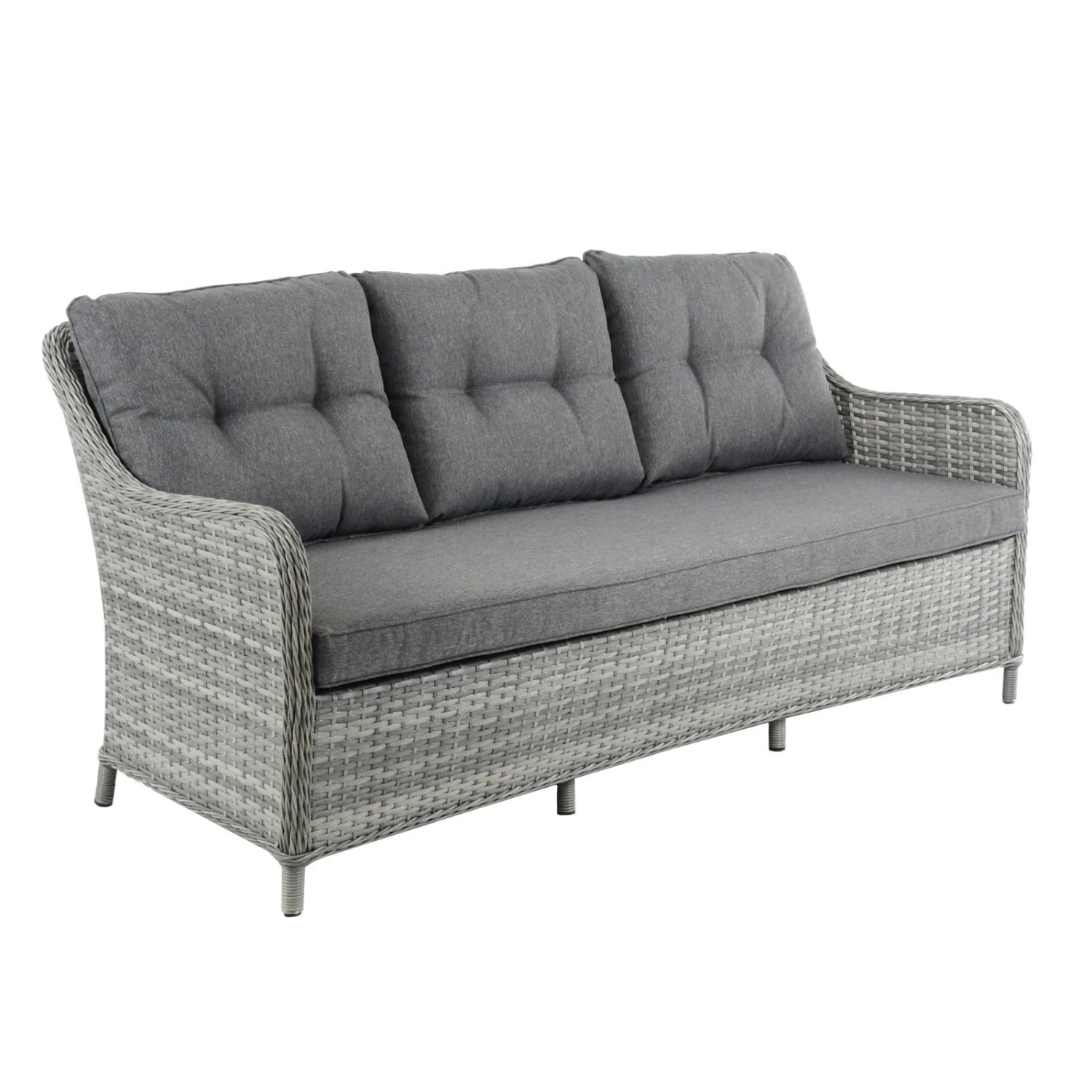 The luxurious, two tone, grey rattan Barletta Sofa Dining Set will seat 7 adults and includes a 3 seater sofa, 2 armchairs, 2 ottoman seats and a glass topped dining table. Comes with grey seat pads and button tufted back cushions.