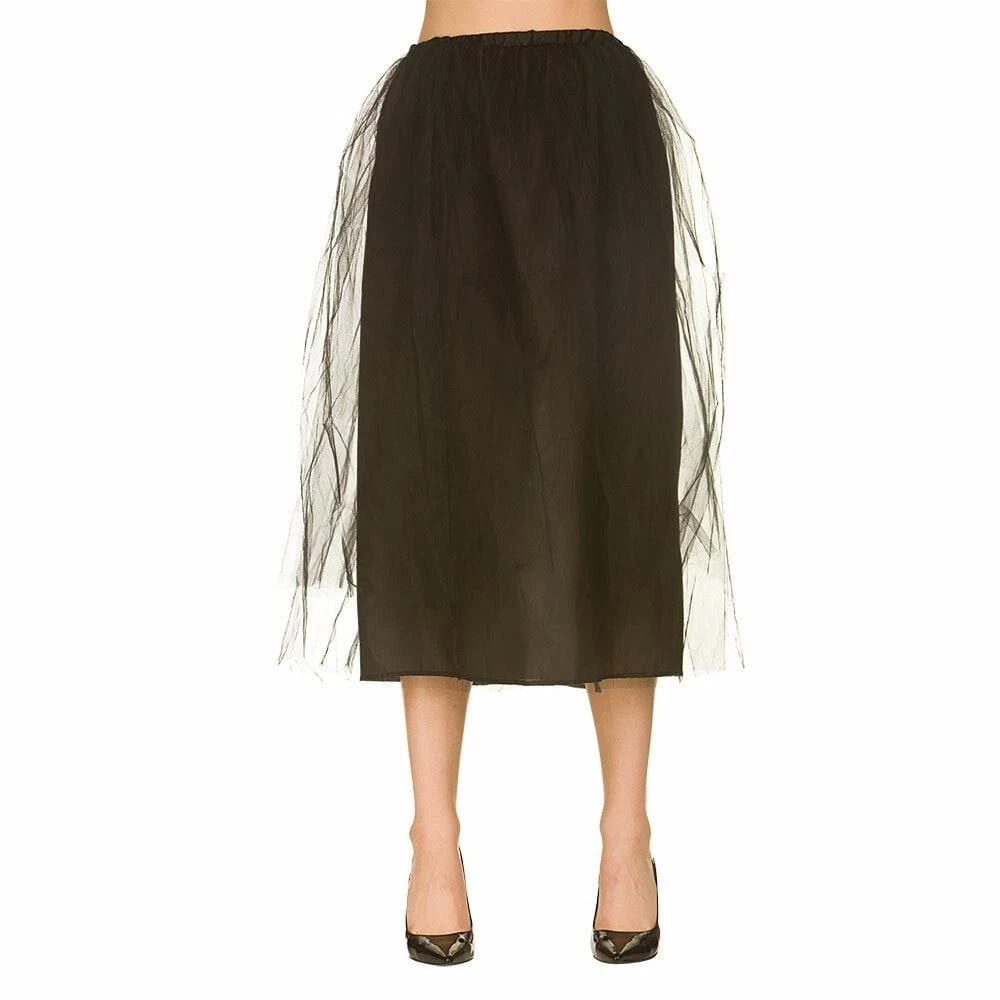 The black skirt has a layer of tulle to give the effect of a shroud.