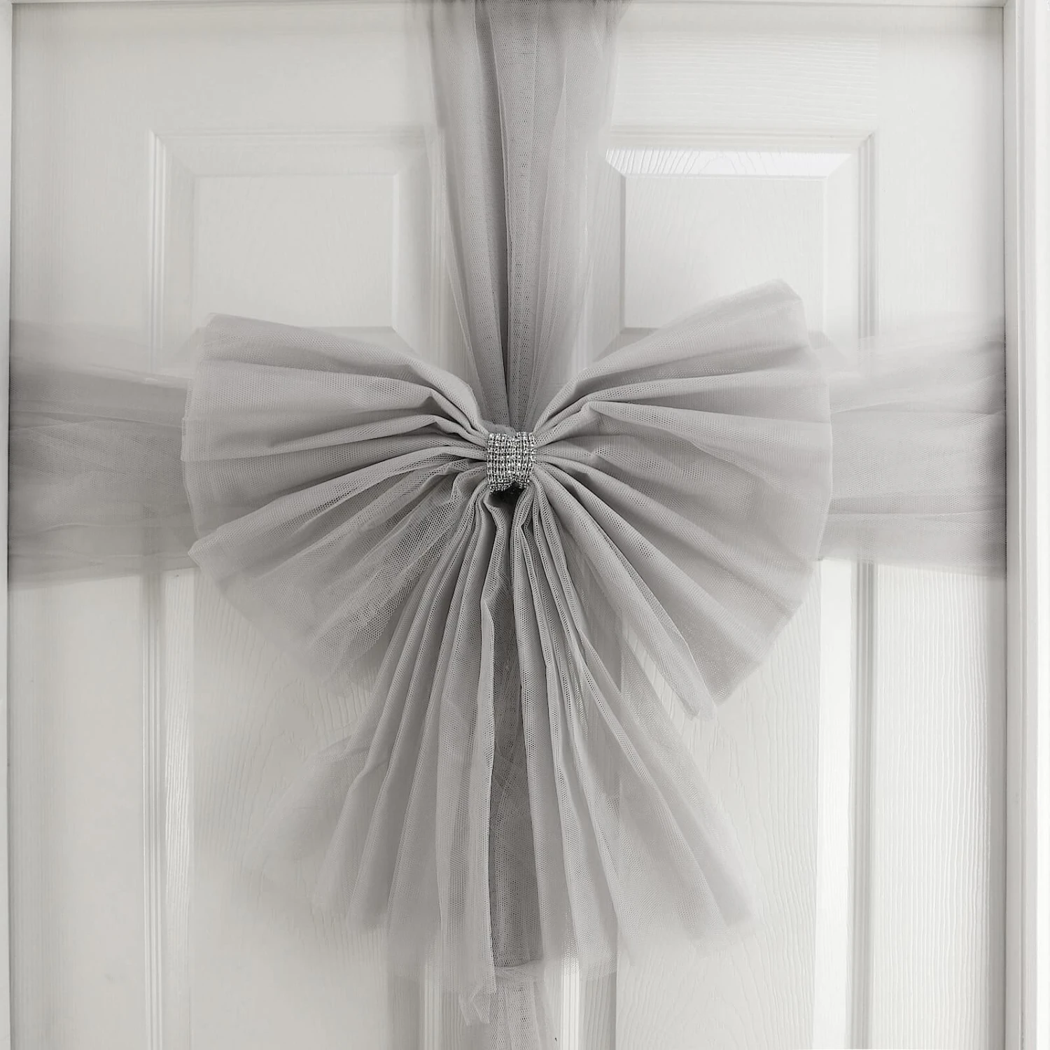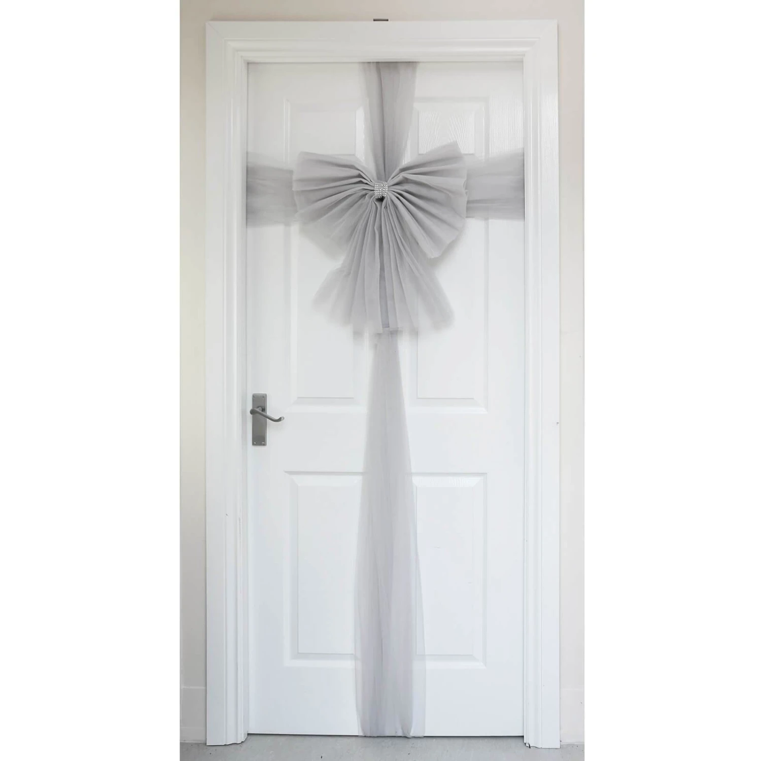 Make a seasonal statement and welcome guests with this gorgeous decorative front door bow from the Mr Crimbo range. The tulle mesh fabric bow is finished with a sparkling diamante ribbon. Available in red or silver.