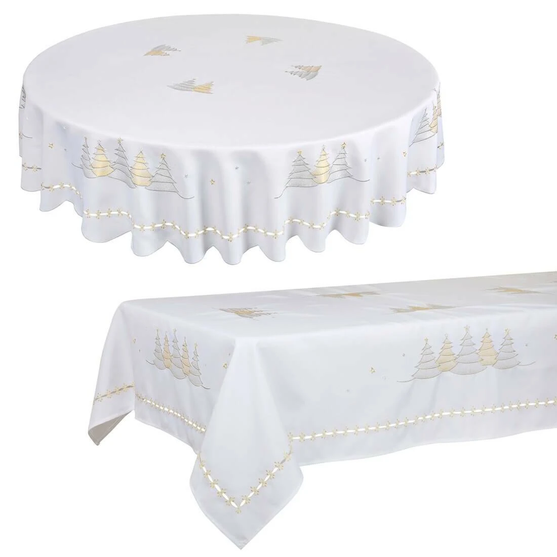 Xmas Tree – White: White tablecloth styled with a gold and silver embroidered Christmas tree design and stitched edges.