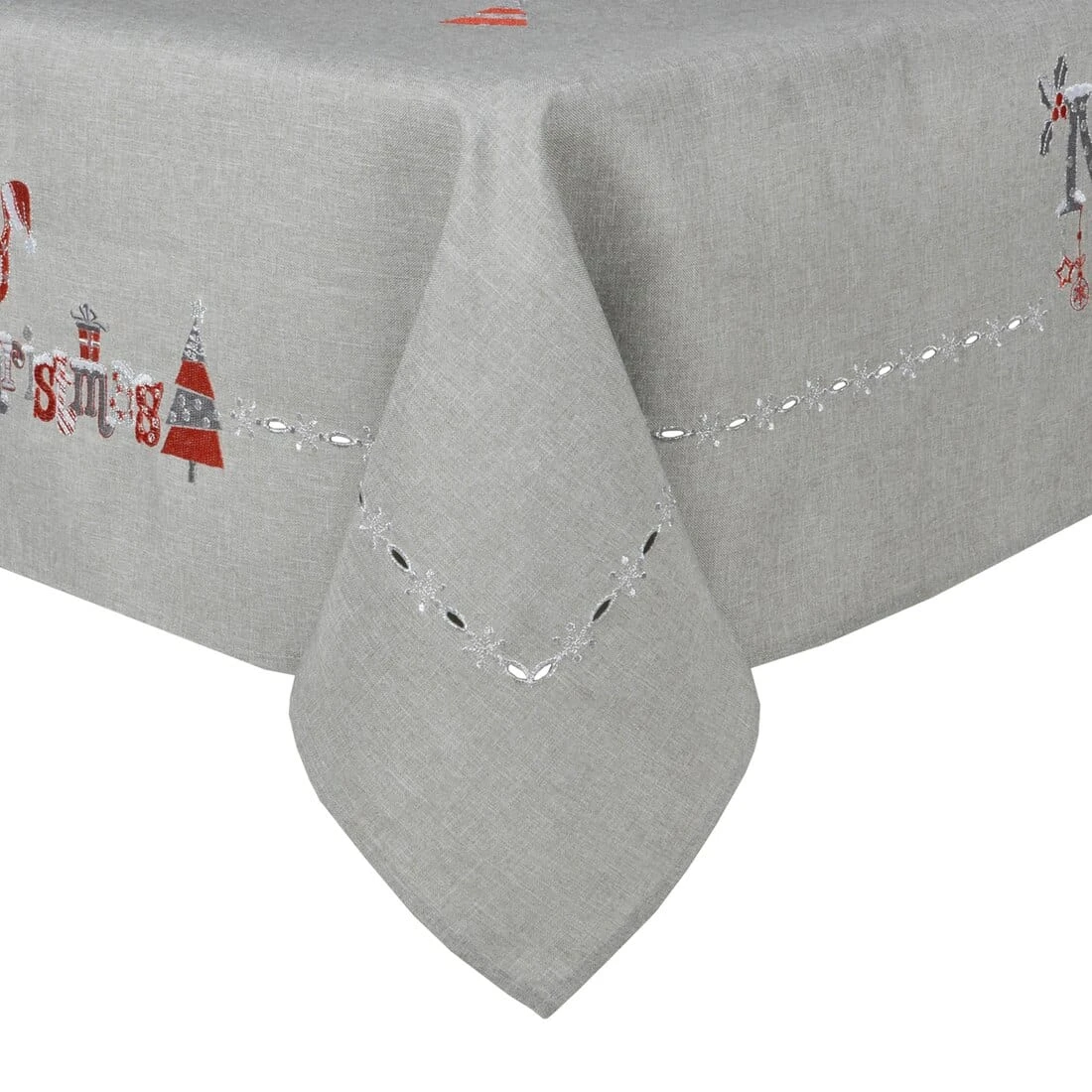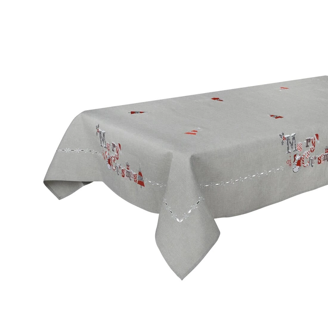 The grey tablecloths feature an embroidered red, silver and white “Merry Christmas” text with a snowman character and other Christmassy details.
