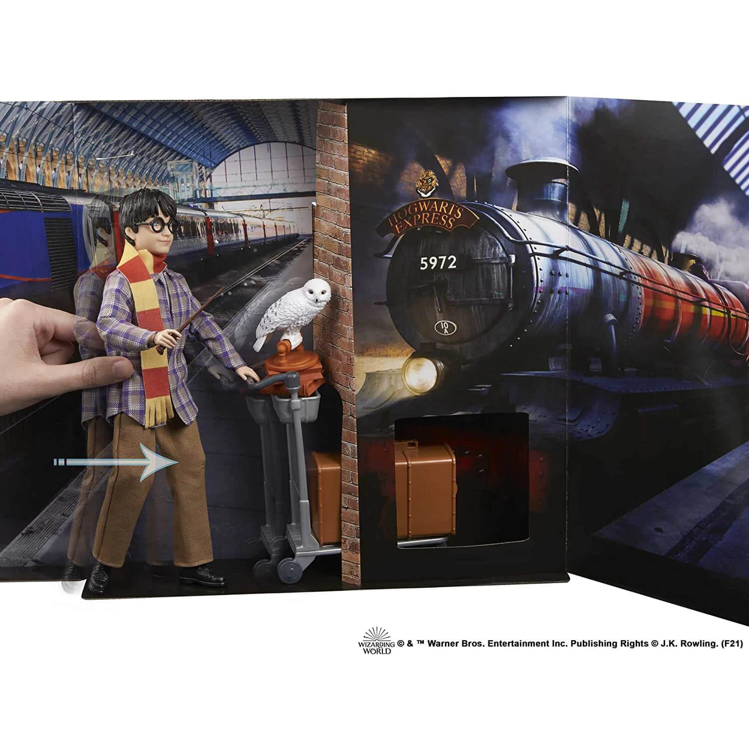 Young witches and wizards (and collectors) can recreate the journey back to Hogwarts! Inspired by the iconic Platform 9¾ scene, this playset includes Harry Potter doll with wand, Hedwig the snowy owl, trolley and luggage.