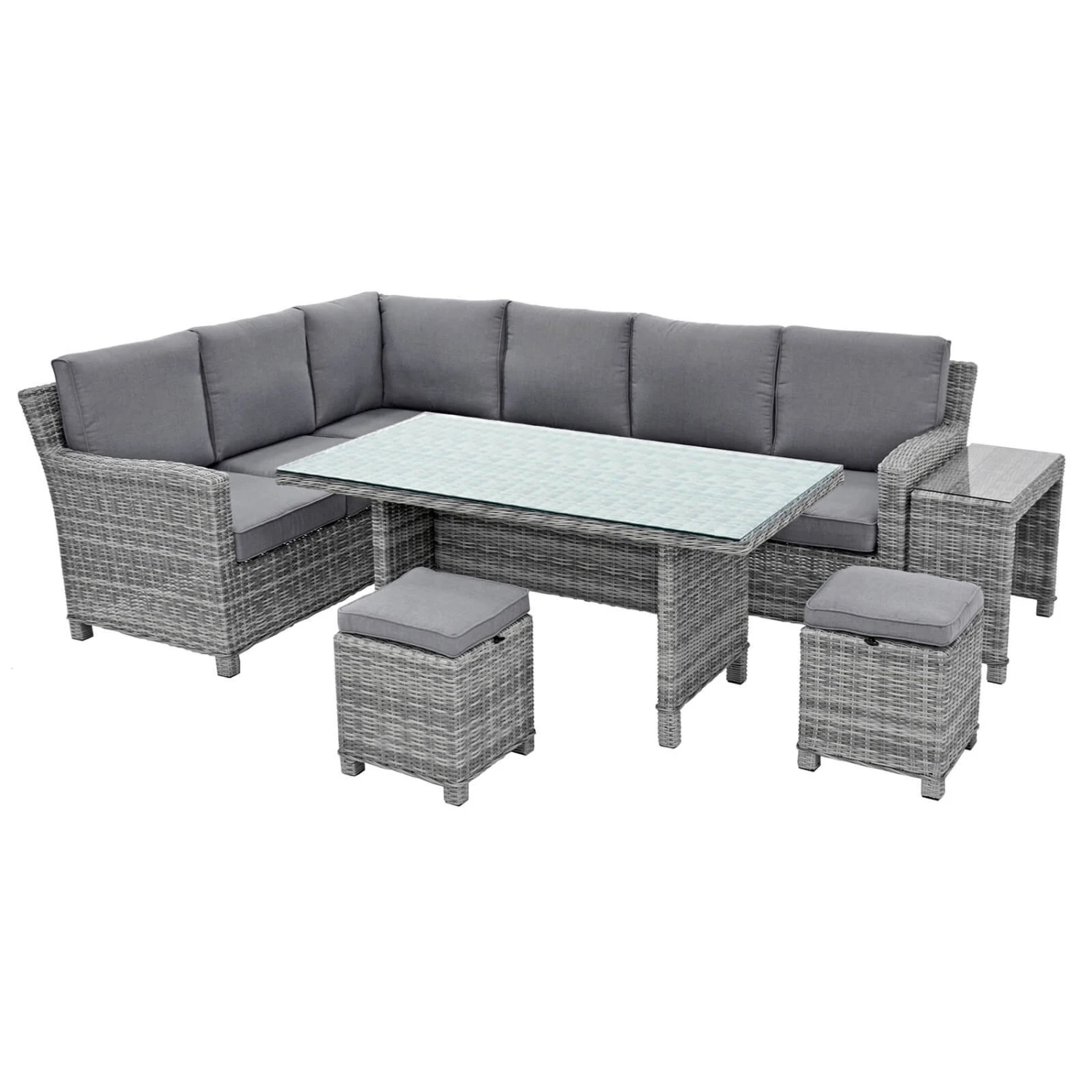 The luxurious, two tone, grey rattan Havana Sofa Dining Set will seat 8 adults and includes 2 x 3 seater sofas, 2 stools, a dining table and a side table. Comes with grey seat pads and back cushions.