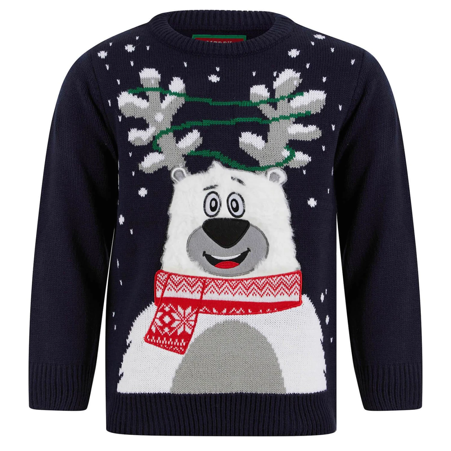 It features a white fluffy polar bear with a festive scarf and antlers with multicoloured light-up flashing lights wrapped around them.