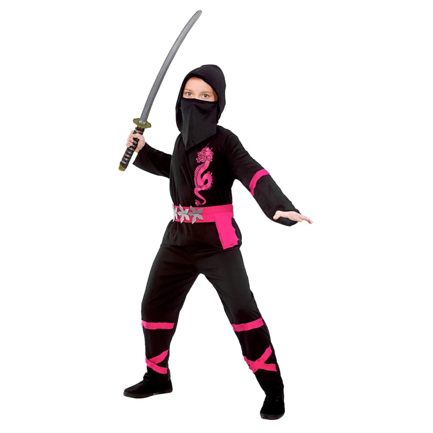 The Samurai warrior outfit for boys and girls includes black hooded shirt and trousers with colour trim and dragon detail. The belt is decorated with silver fabric throwing stars. The child’s power ninja costume is complete with a black face mask.