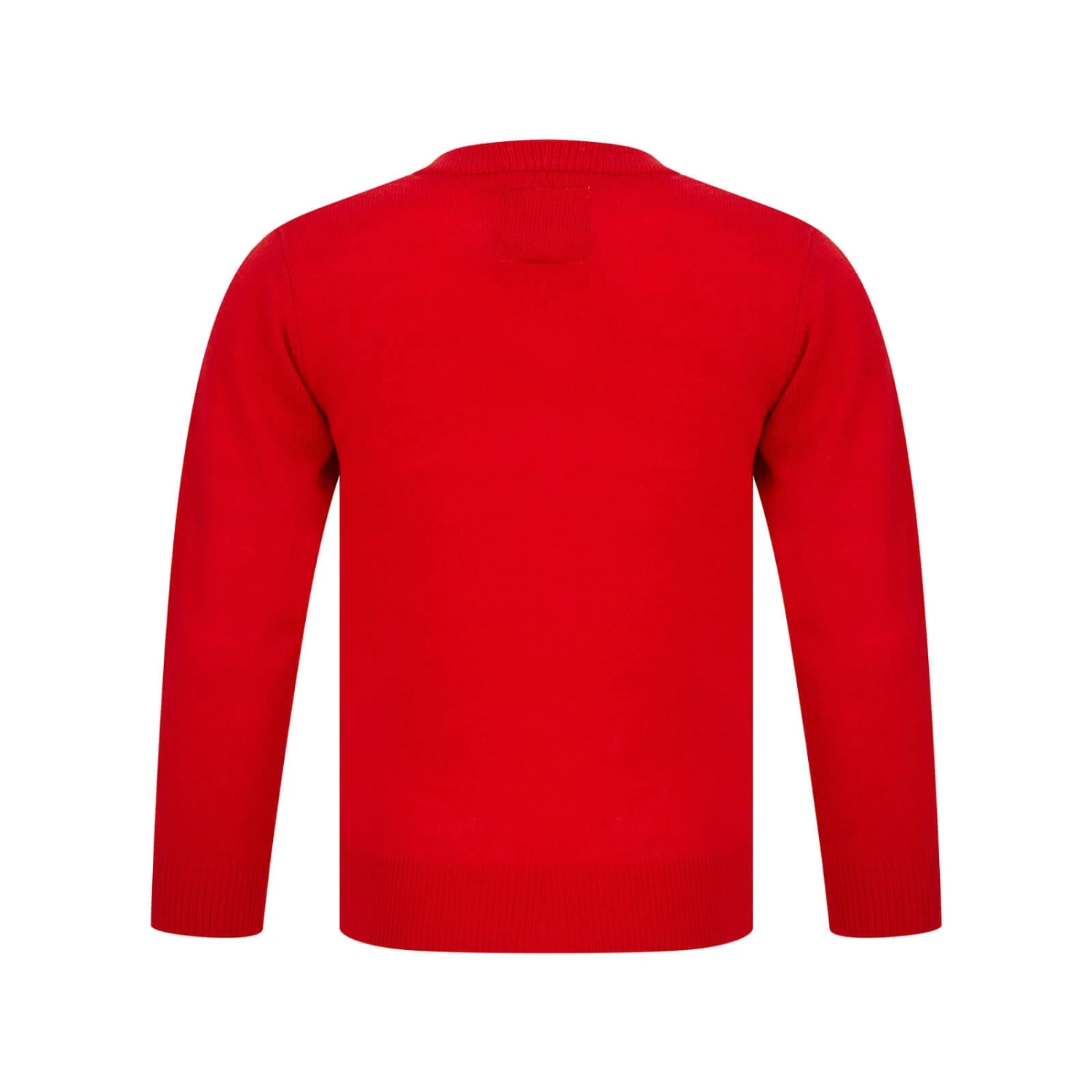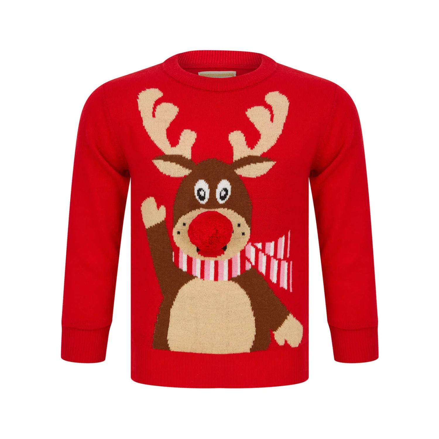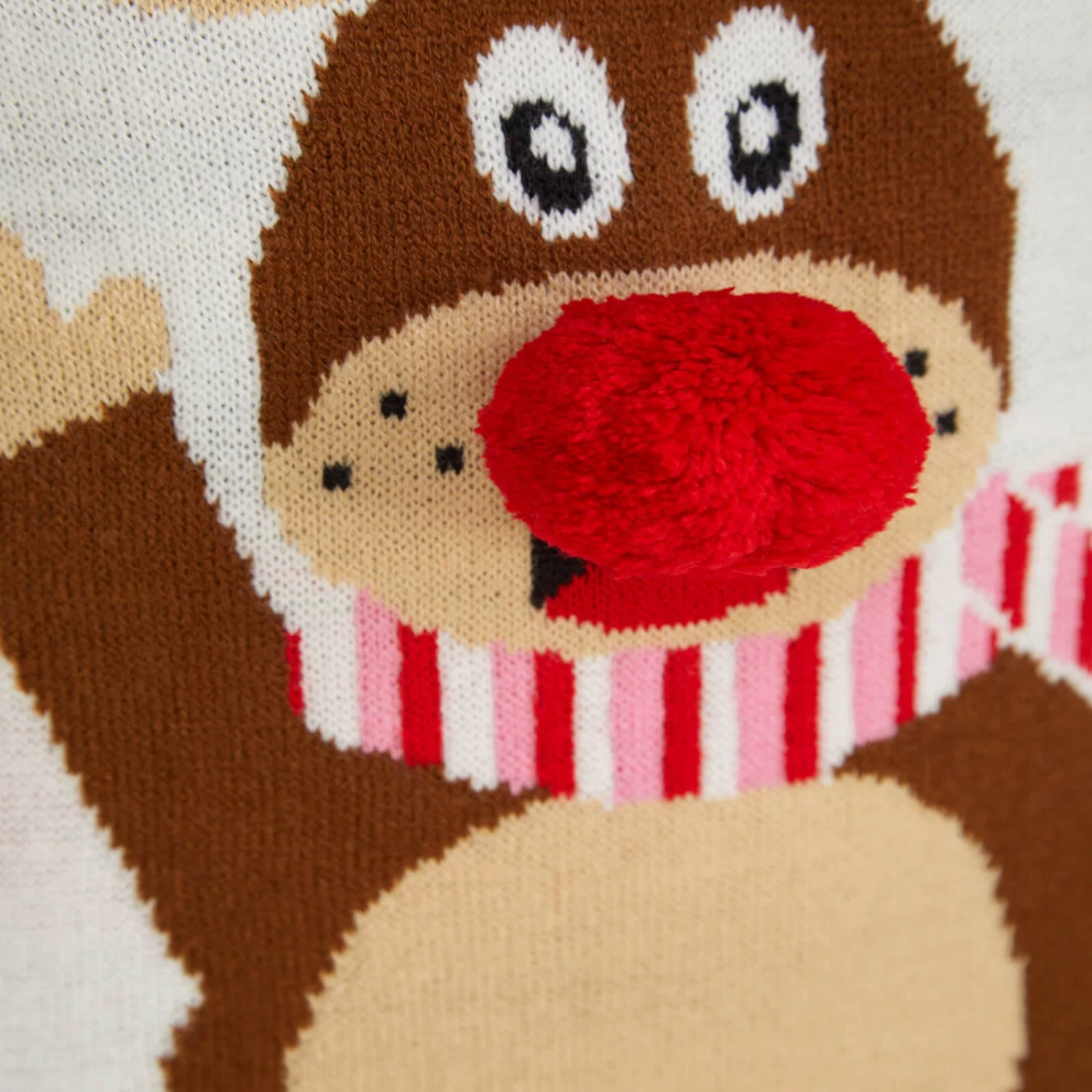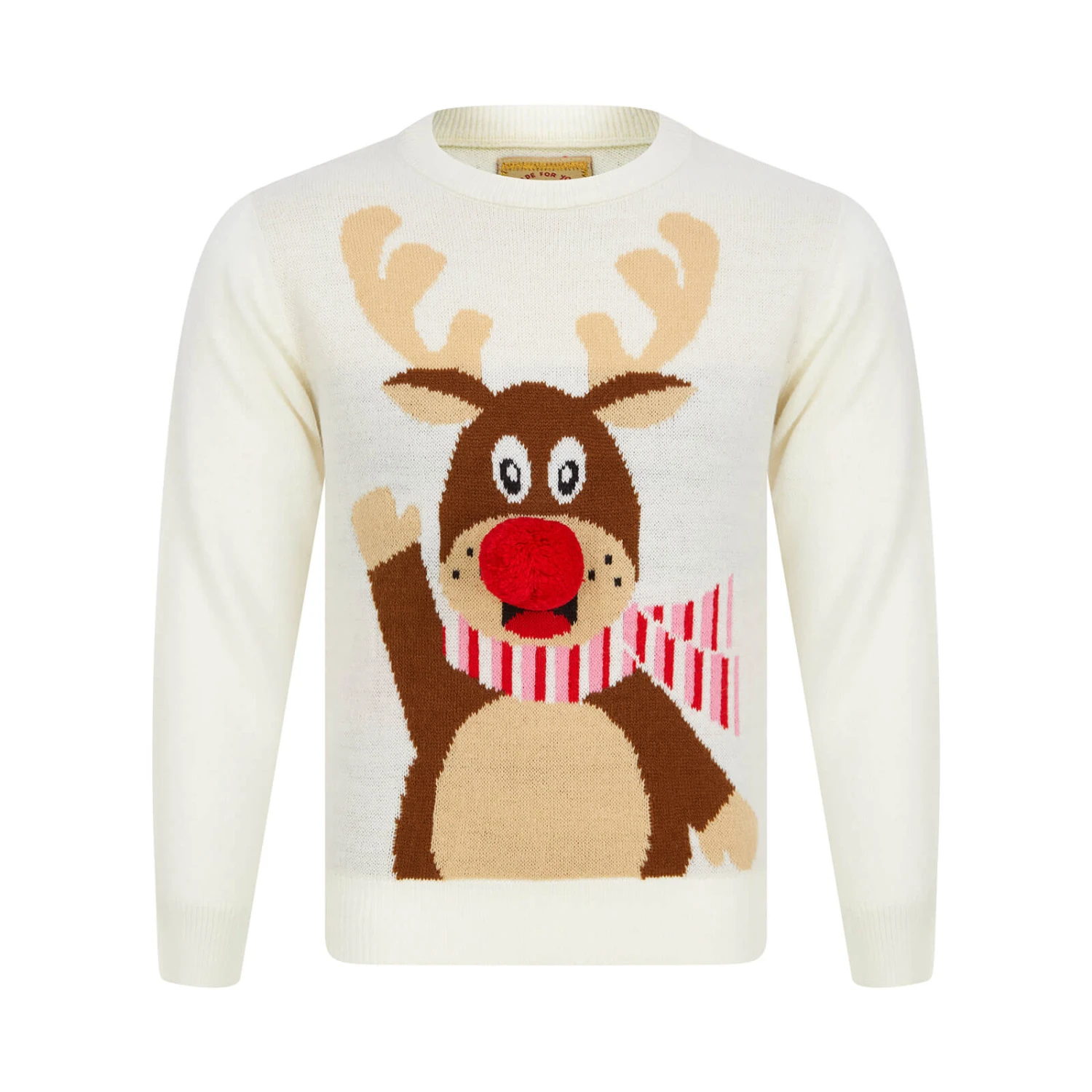 Your little one will love wearing this cute Christmas jumper over the holidays. The Xmas sweater features Rudolph the reindeer with pink, red and white striped scarf and a large red pom pom nose happily waving to anyone who passes by. The soft knit, crew neck Christmas jumper for children is available in Gardenia or Red and child sizes age 4 to 12. Perfect for family seasonal celebrations, Christmas Jumper Day and a great gift idea!