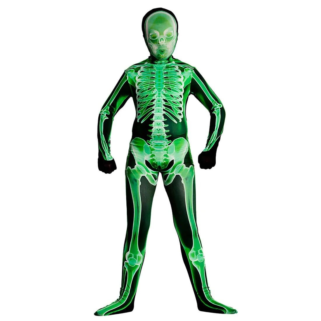 The green and black full-length costume fits like a second skin covering the whole body with realistic white skeleton detail print.