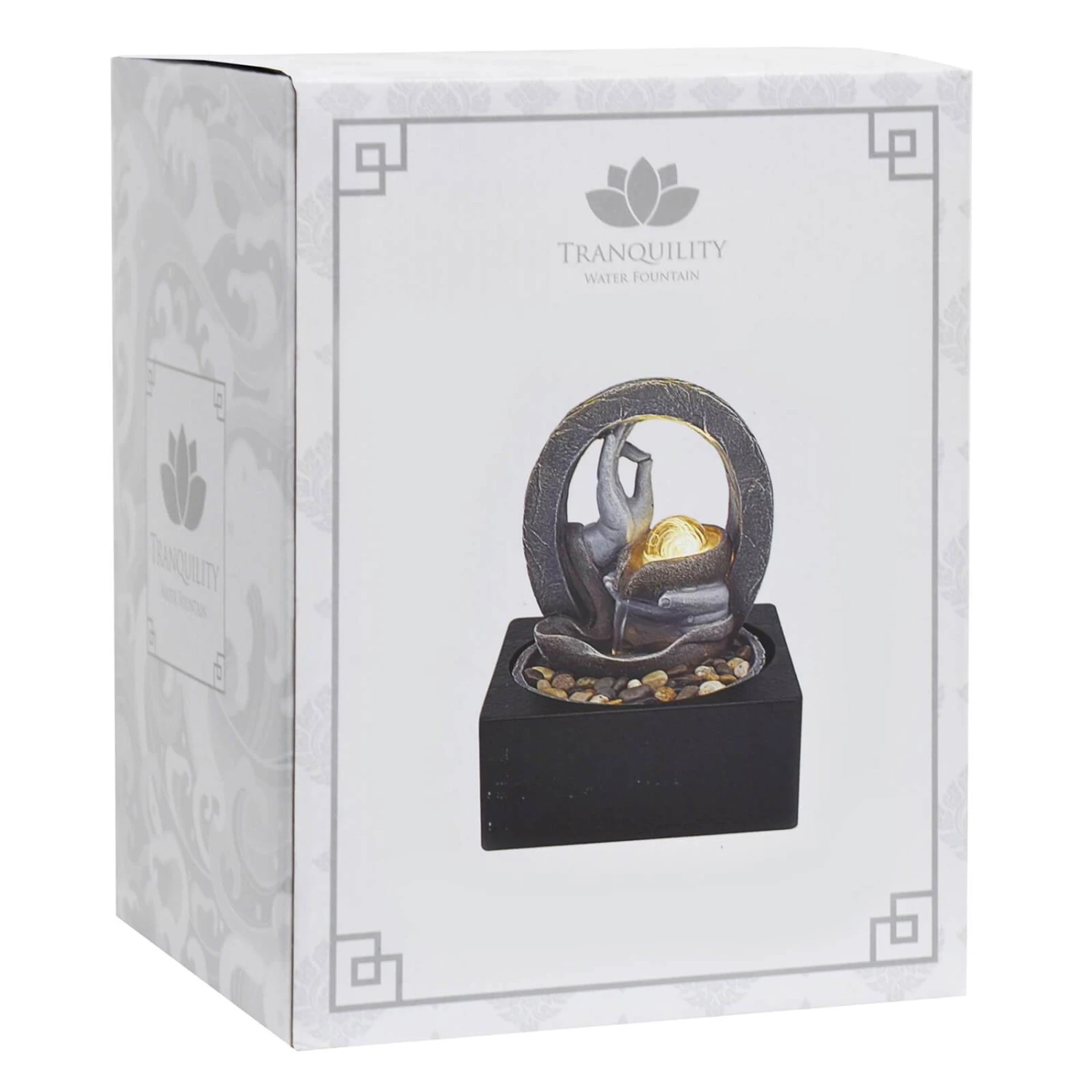 Create your own oasis of calm with this indoor water fountain. The finely detailed design features 2 hands in an arch with bowl. A glass orb in the bowl lights up with a warm white glow. Decorative river pebbles complete the scene of tranquility. A great gift idea for a new home, birthday or Christmas.