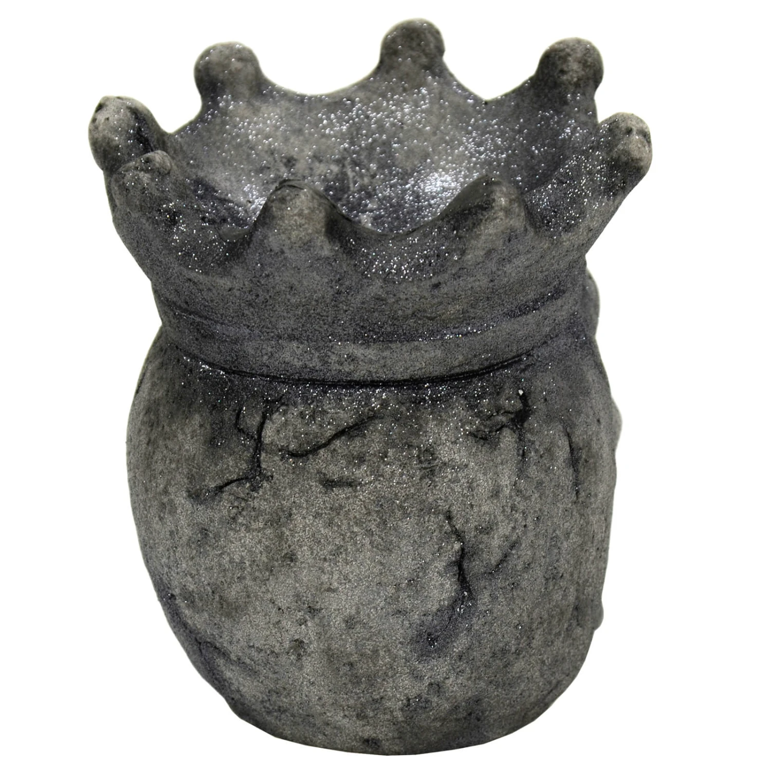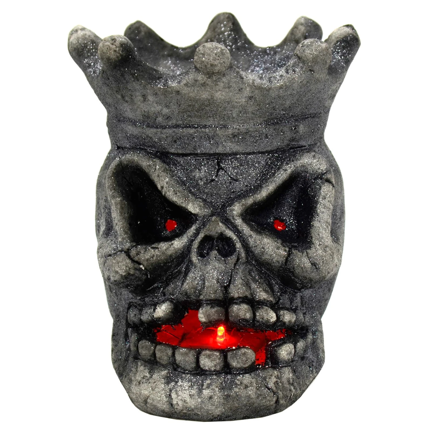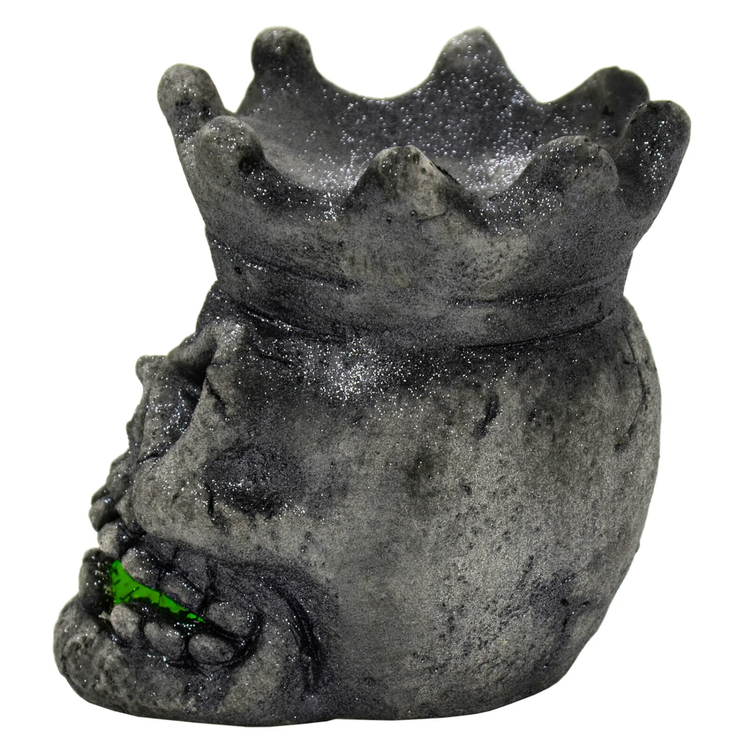 The scary Skull with Crown Candy Holder from Cackle & Co. is lit by 1 colour changing LED light. The large ceramic Halloween decoration is finely detailed with a dark grey, weathered stone effect. Standing 24cm (9.5″) tall this creepy sweet bowl is perfect for a Halloween party treats table.