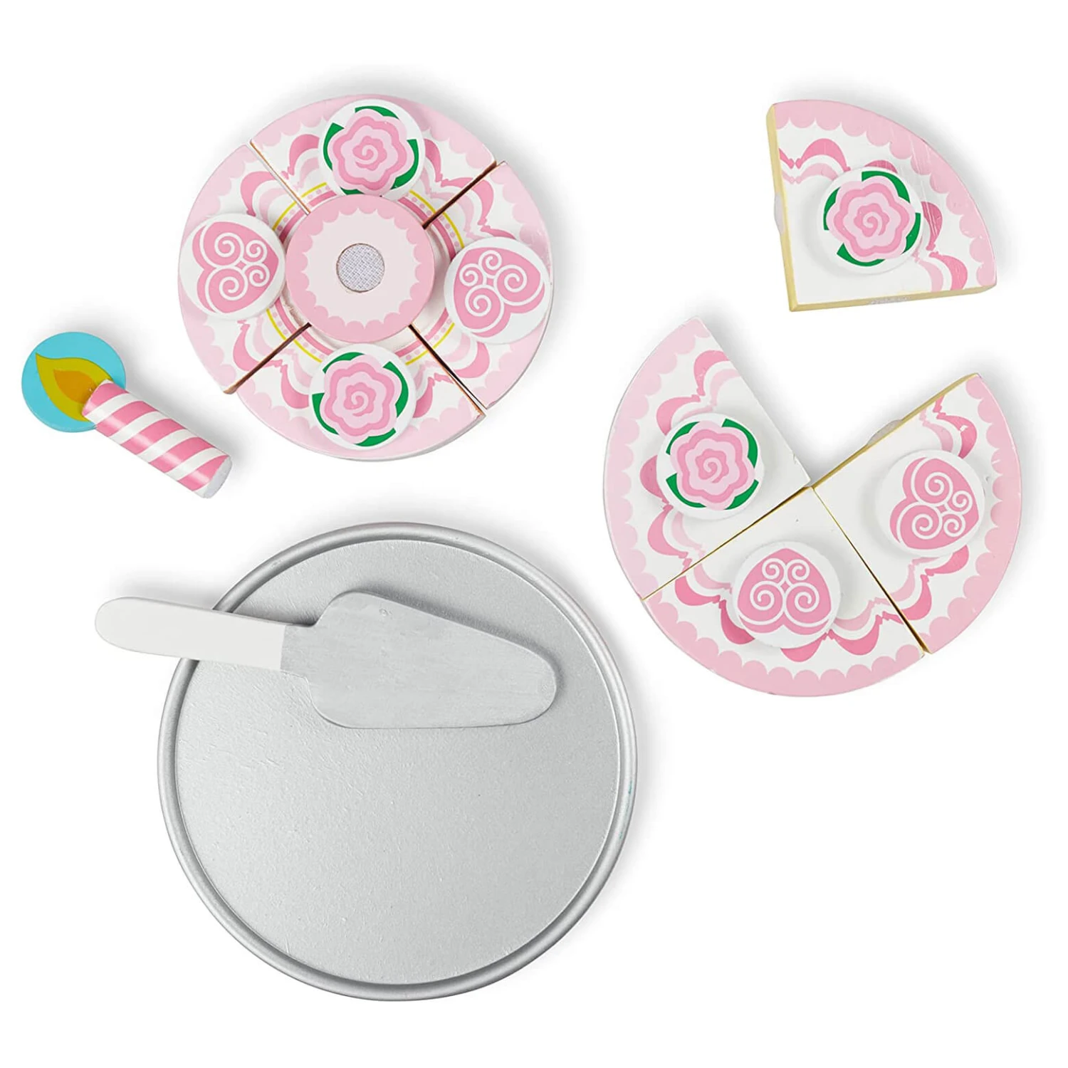 Decorate, slice and serve the Melissa & Doug Wooden Triple Layer Party Cake with 3 tiers for pretend play parties. The wooden play cake set includes 8 cake slices, 8 mix-and-match toppings, cake plate, serving knife, and a candle.