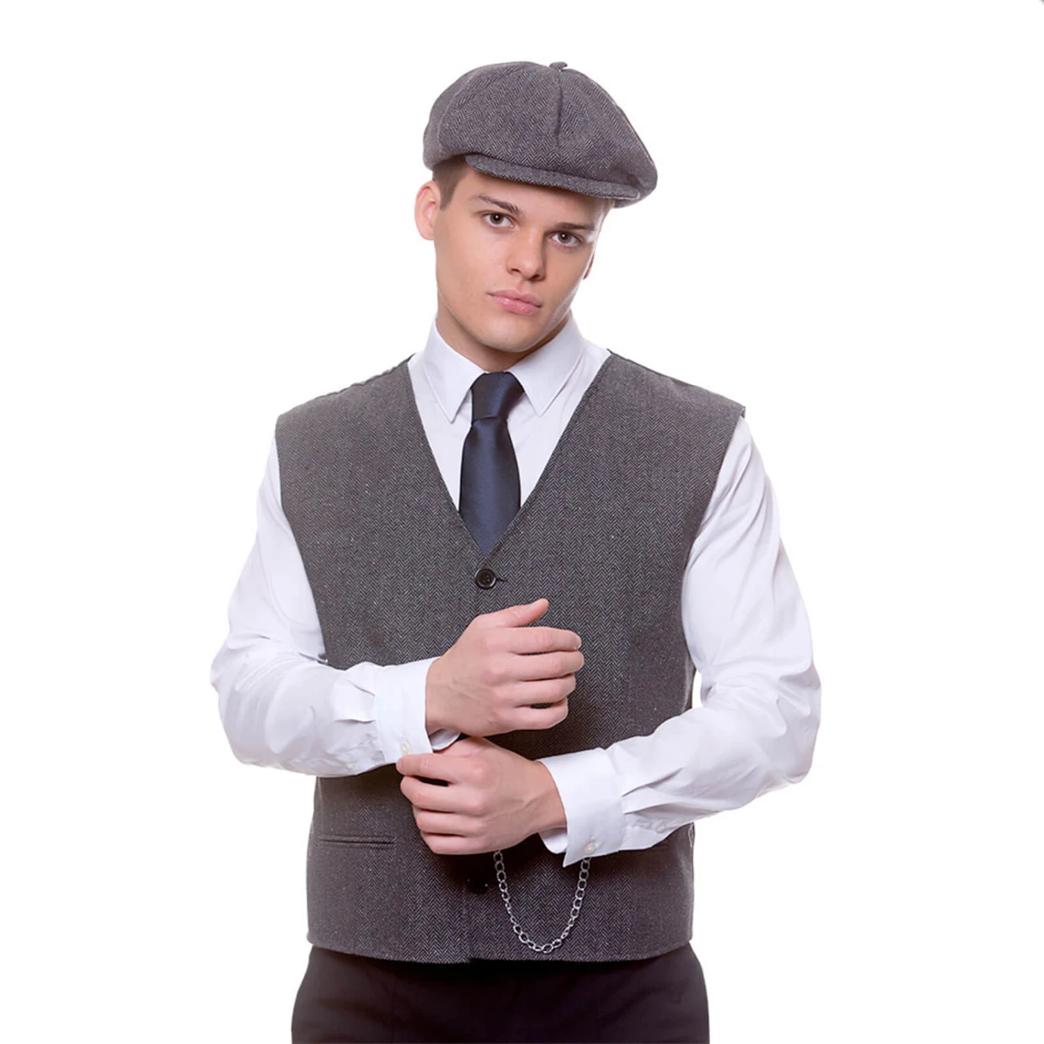 The traditional style waistcoat is made from grey fabric with button front. The matching news boy cloth cap has a short peak and a top button. Great for Tommy Shelby, Al Capone, Pretty Boy Floyd, mobsters, gangsters and lots more fancy dress costumes!