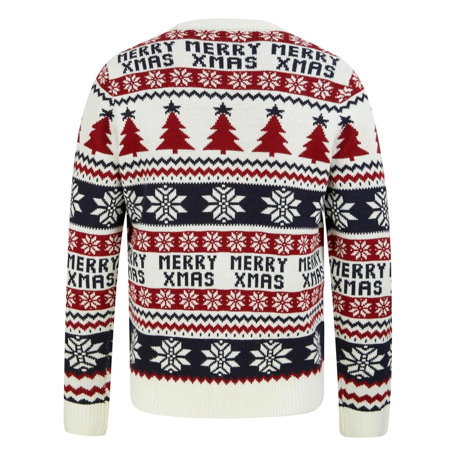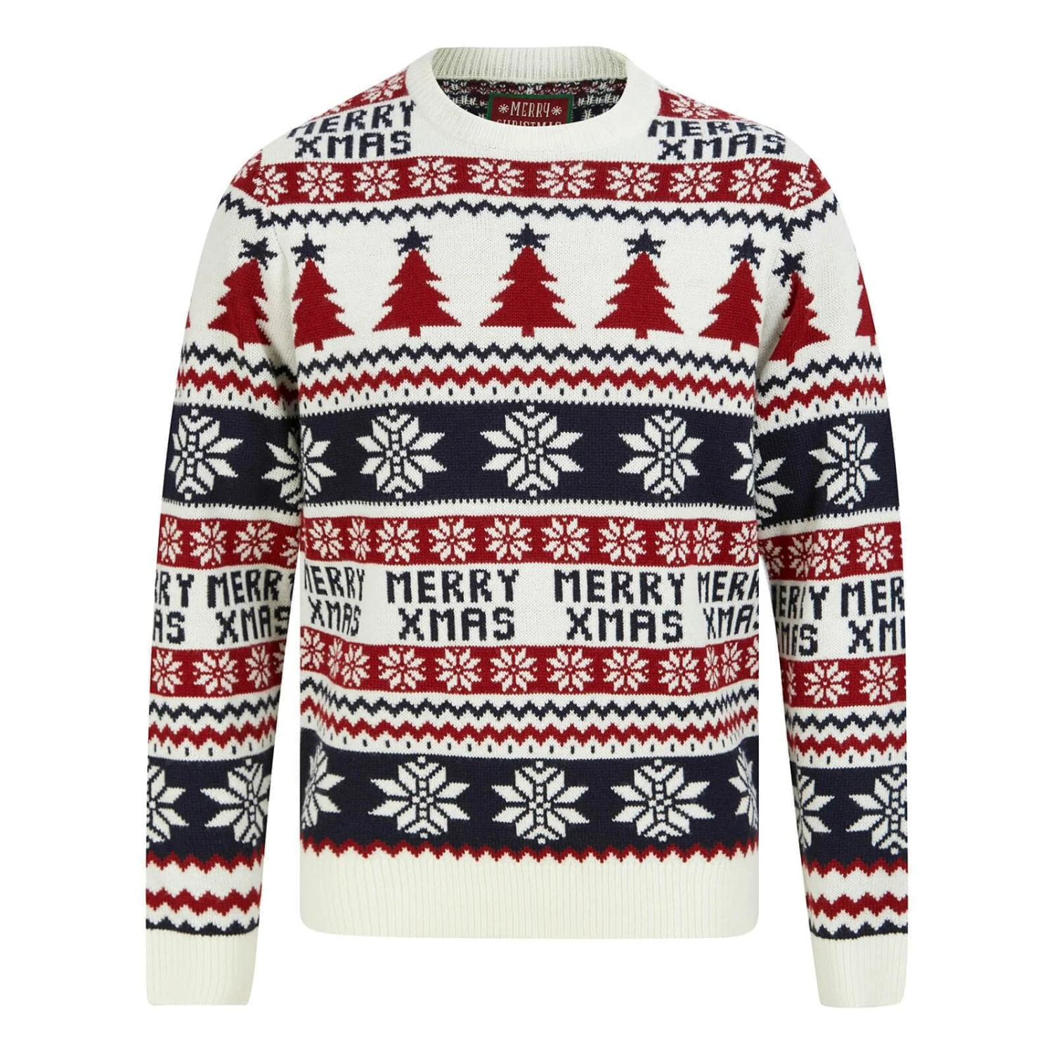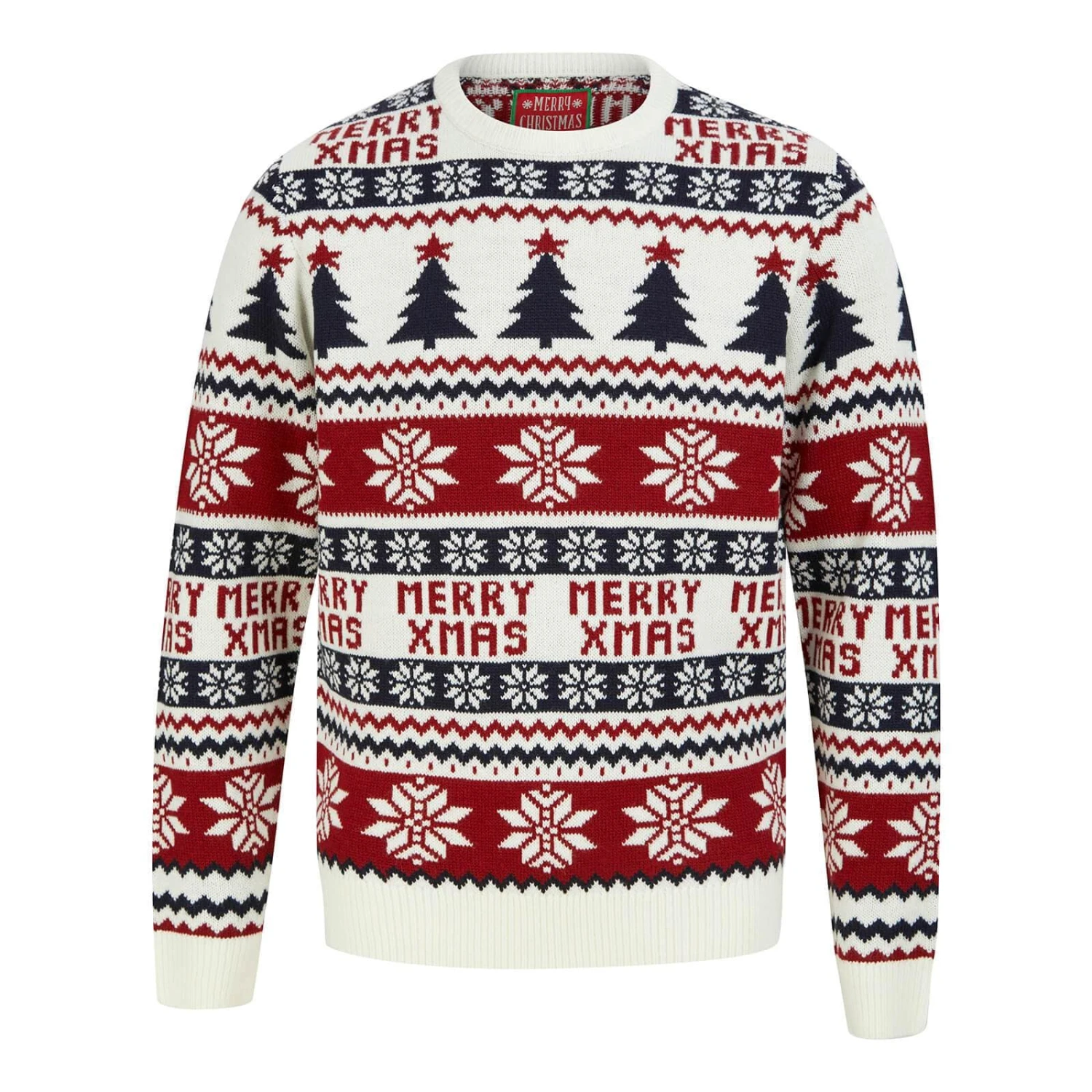 Make the most of the festive season with this traditional knit Christmas sweater. It features a Fair Isle style pattern with Christmas trees, snowflakes and Merry Xmas letters design.