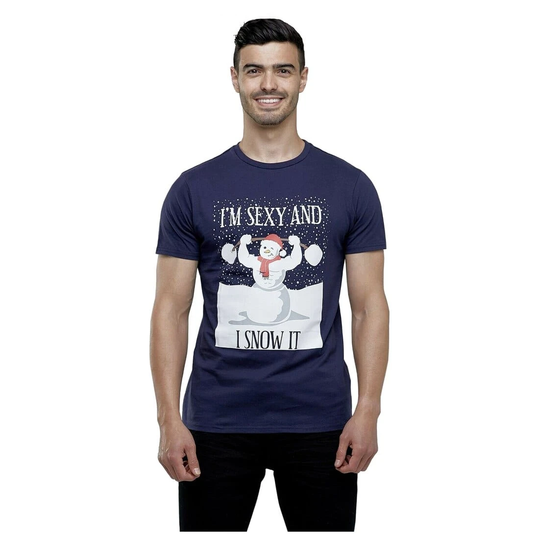 Enjoy the Christmas spirit in this fun t-shirt for men. Sure to raise a laugh or three this navy blue tee features a weightlifting snowman and is printed with the slogan “I’m Sexy and I Snow It”. This novelty Christmas t-shirt is available in men’s sizes from S, M, L, XL or XXL. Perfect for the office party and a great gift idea for the man in your life!