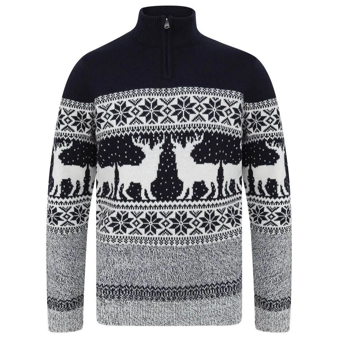Have fun over the festive season in this traditional style Christmas sweater. Based on the Gullfoss waterfall in Iceland, the design features reindeer and snowflake patterns. The high neck has a zip fastening for comfort. This Fair Isle style Christmas jumper is available in dark navy or ecru colours in mens sizes S, M, L, XL or XXL. Perfect for family seasonal celebrations and a great gift idea for the man in your life!