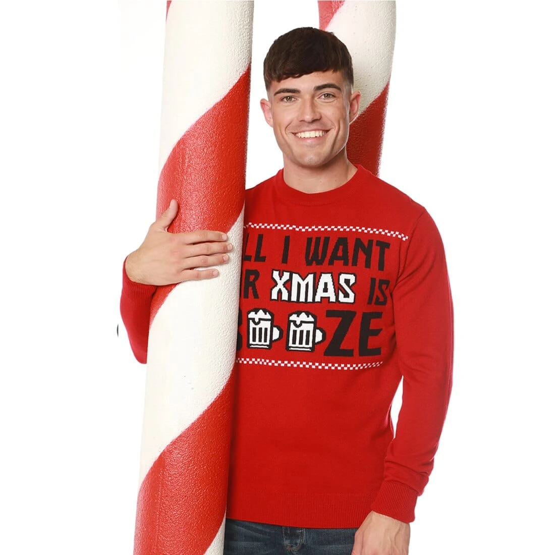 Each knitted jumper features a novelty pullover design with the words “ALL I WANT FOR XMAS IS BOOZE” and two steins of beer knitted into it. The jumpers are available in George red or Christmas green colours and in mens sizes small, medium, large, extra large and extra-extra large. Perfect for Christmas jumper day, Christmas nights out or as a hilarious gift for a loved one.