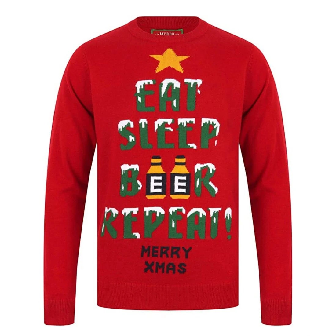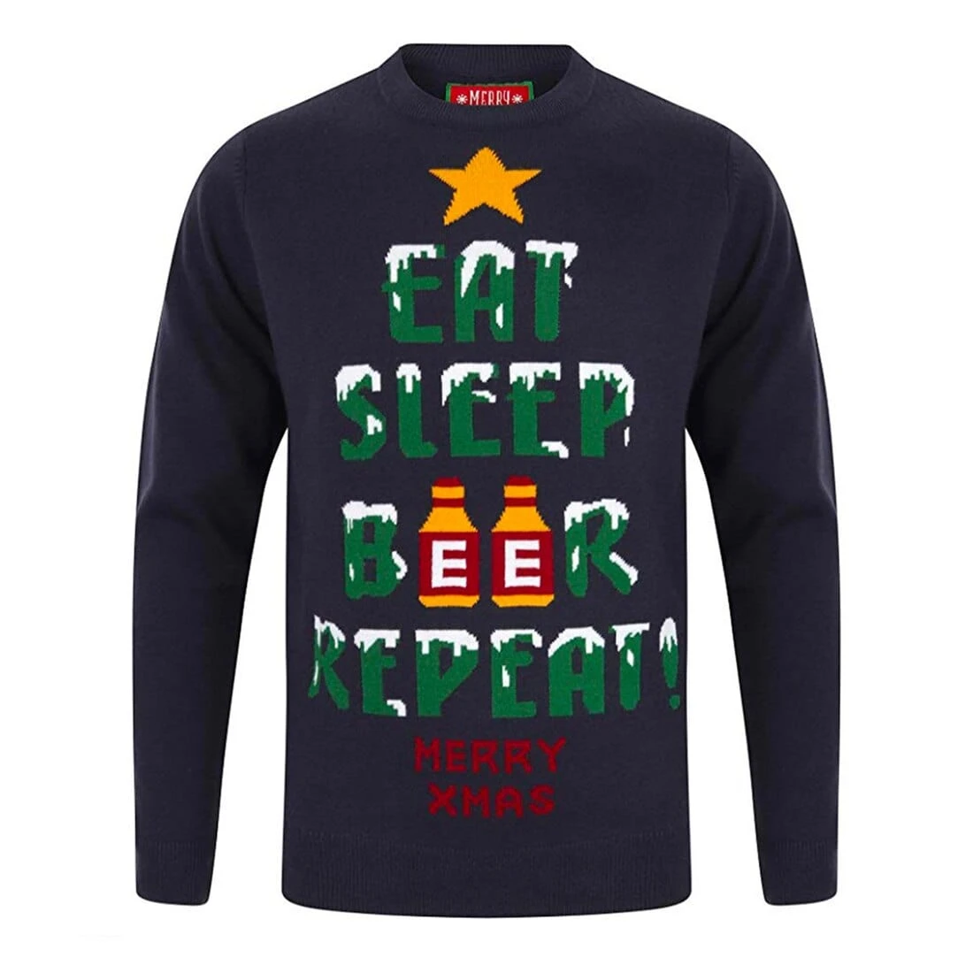These knitted jumpers feature a pullover design with the words “EAT SLEEP BEER REPEAT!” and star and beer details.