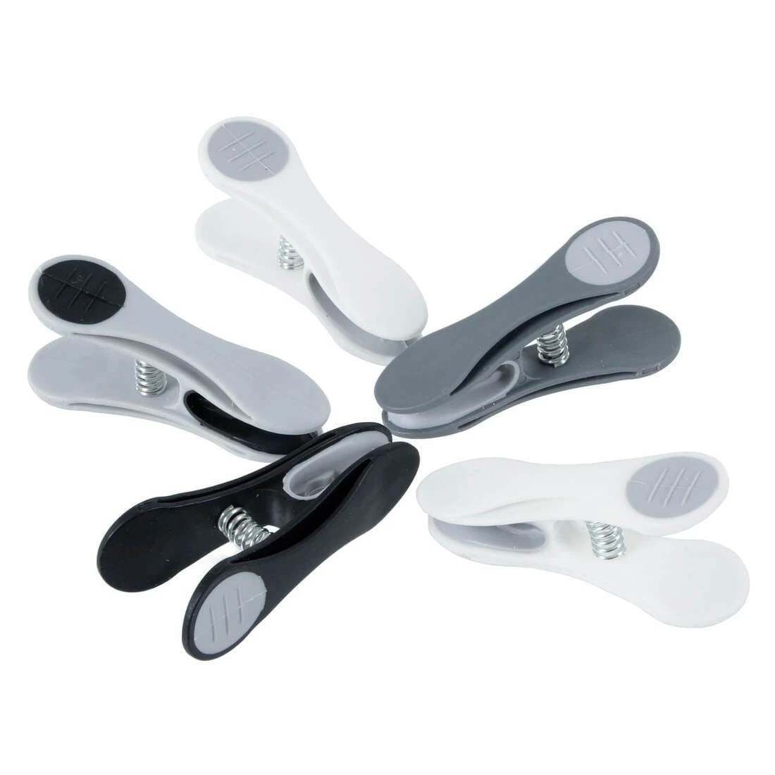 Pack contains 50 Soft Grip Clothes Pegs from the Micro-Pro brand. The washing line pegs have cushioned grips which won’t leave marks on your clothing. They have anti-slip ridges for securing the most delicate items, and strong springs which won’t weaken over time. The laundry clips come in light grey, dark grey, black and white, with contrasting finger grips. Peg length: 7cm (2.75″)