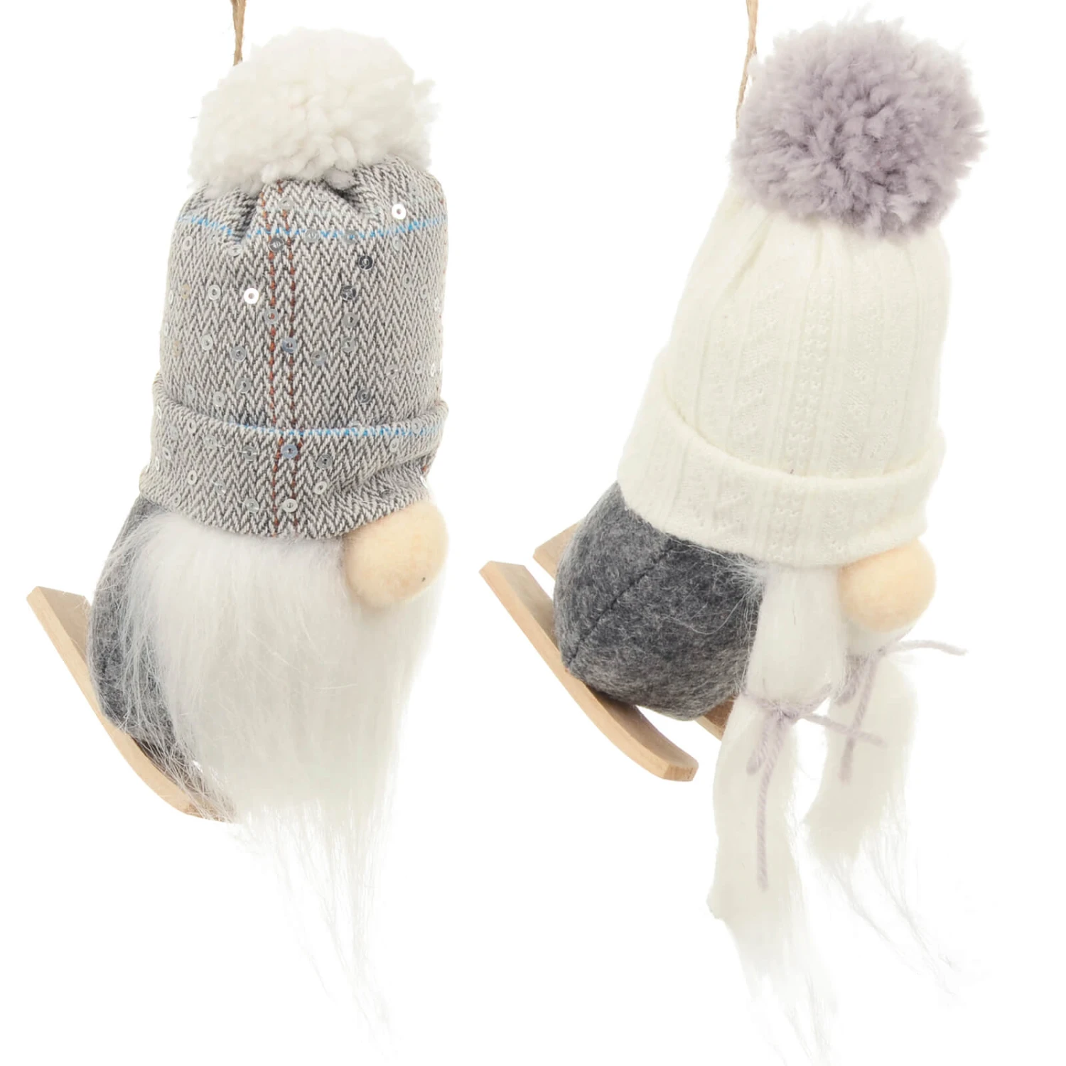 The grey and white, Scandi-style gonks Christmas tree decorations from Mr Crimbo are made from fleece, woven and soft knit fabrics. The Christmas gnome couple have wooden skis and big pom pom bobble hats. At 17cm ((7″) long they are perfect for adding to your silver and white theme Christmas decor.