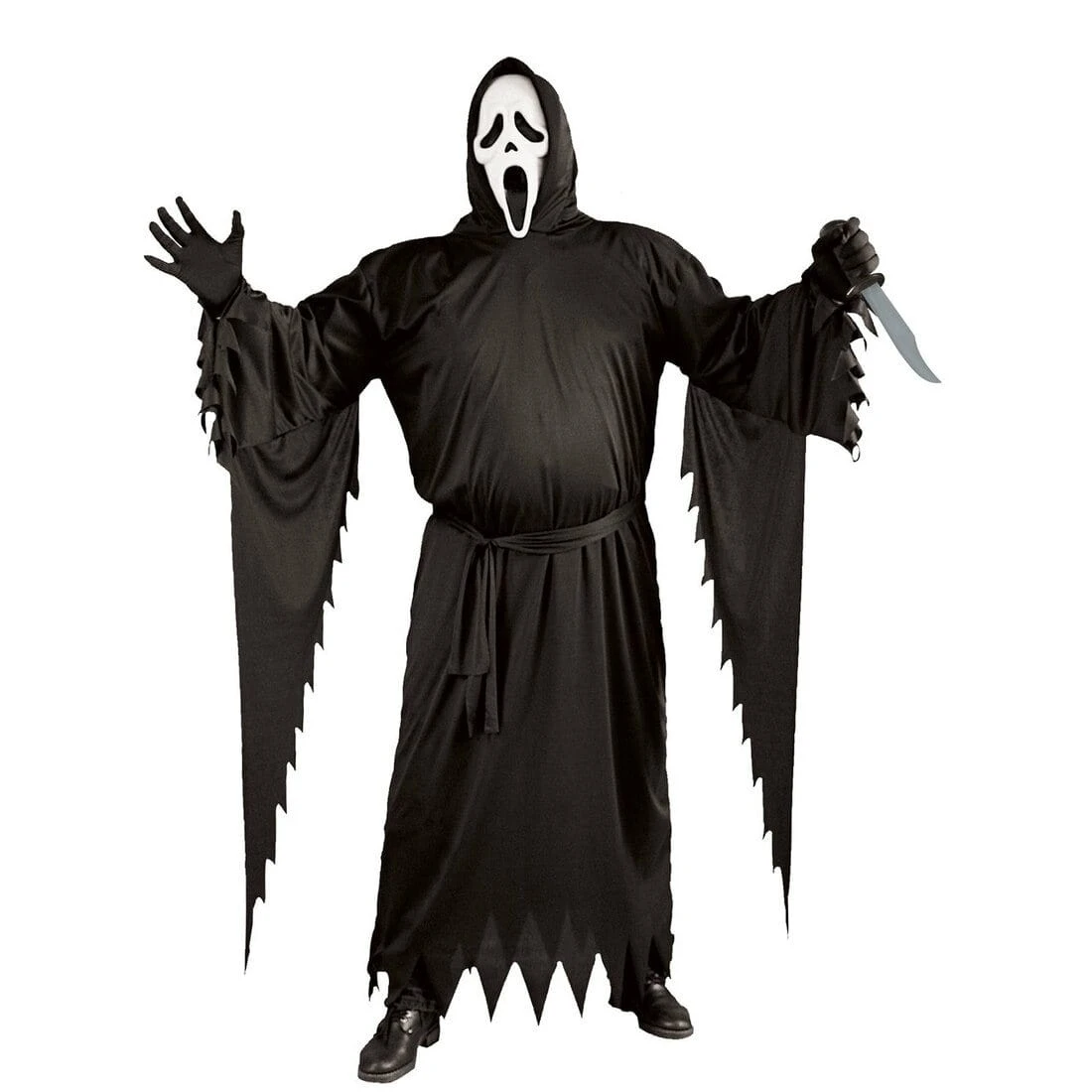 It includes a black hooded robe with draped sleeves, ghost face mask and a black belt