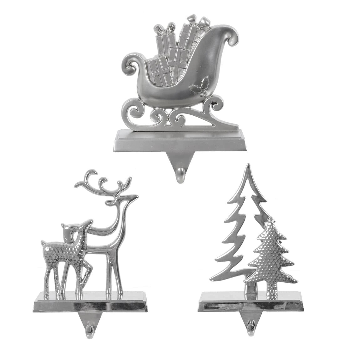 Each stocking holder is made from silver metal with a weighted base to help keep it firmly in place. Simply slip the hanging loop of your stocking over the metal hook on the base. Choose from festive Santa sleigh, double reindeer and double Christmas tree styles.