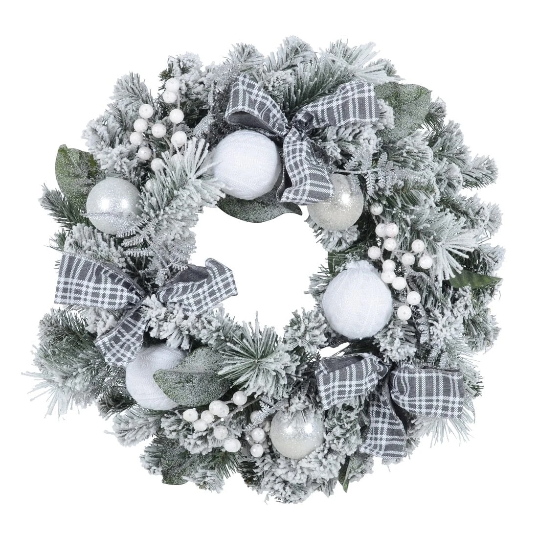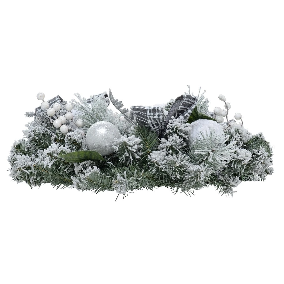 • Mixed green and silver foliage covered with flocked snow