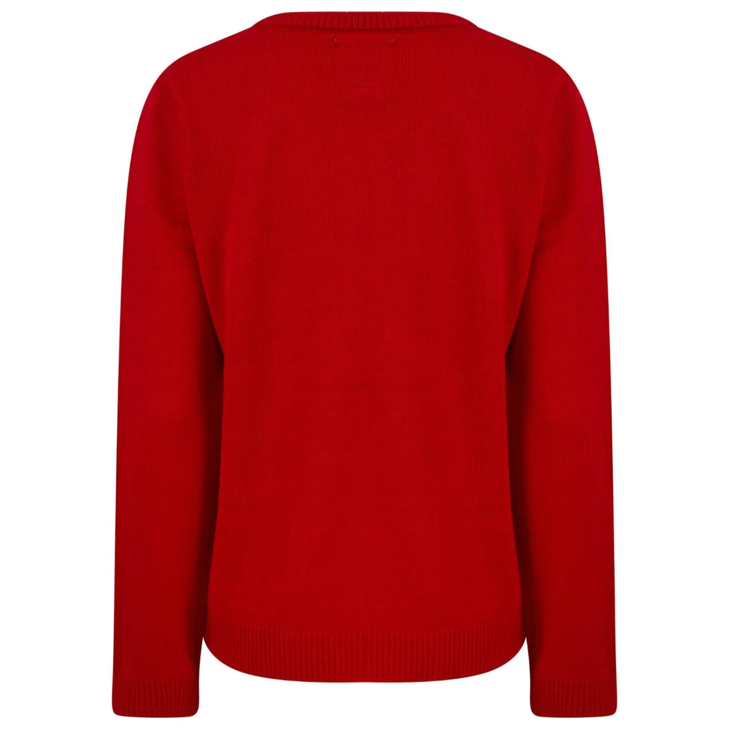 This fabulous ladies Christmas jumper features a very cute happy prancing reindeer complete with a red nose, gold sequin antlers and a faux fur face and body.