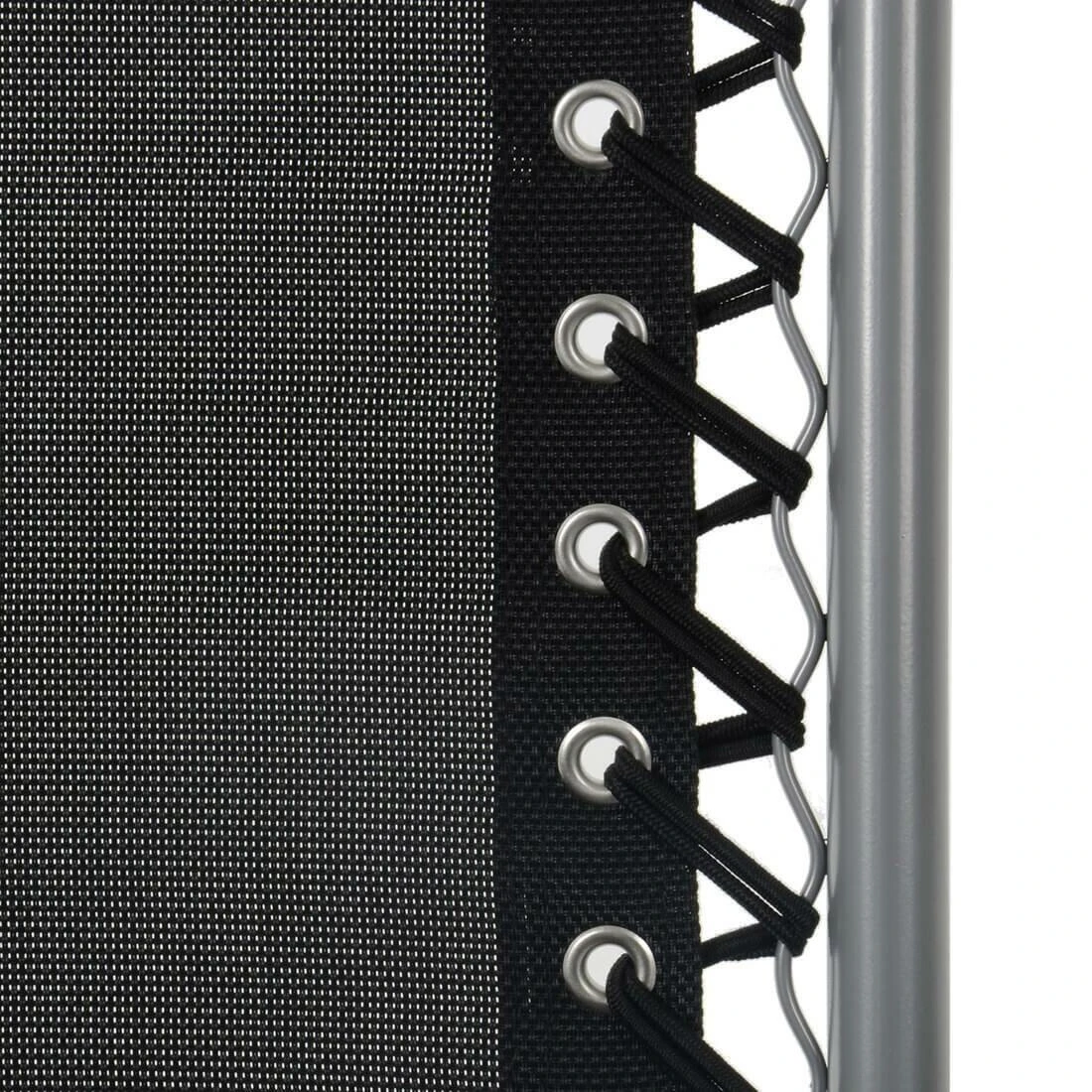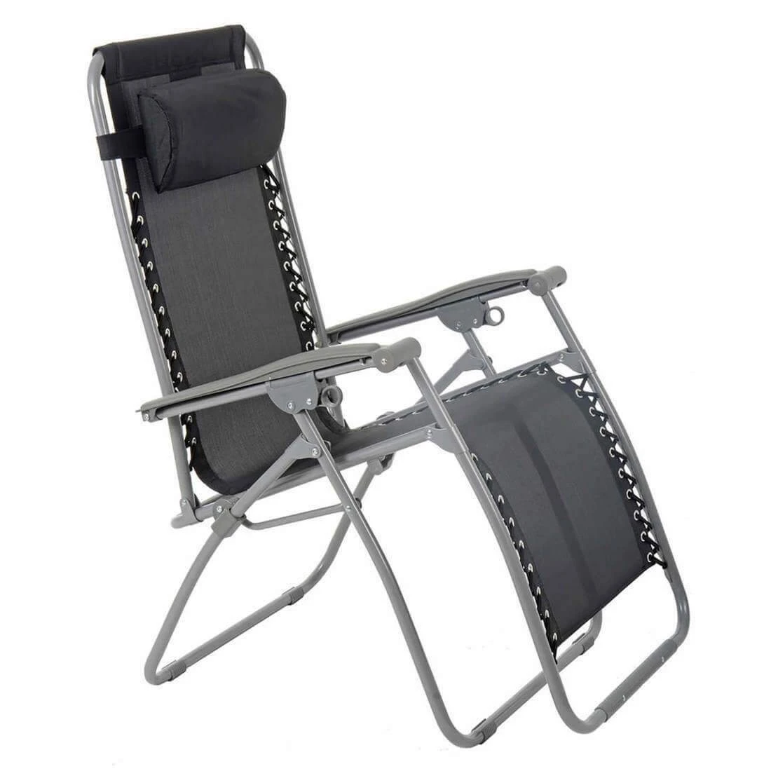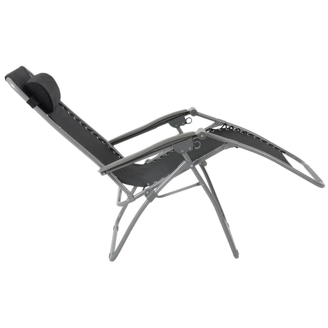 This Azuma zero gravity sun lounger is made from black hard wearing texteline material. Texteline is UV resistant, comfortable to sit on and easy to clean with a cloth and warm soapy water. The seat is attached to a strong silver powder coated tubular steel frame with elastic cords. The silver frame features silver plastic arm rests and anti-rust screws with plastic caps. The adjustable headrest pillow can be removed using the hook and loop fastener on the elastic belt.